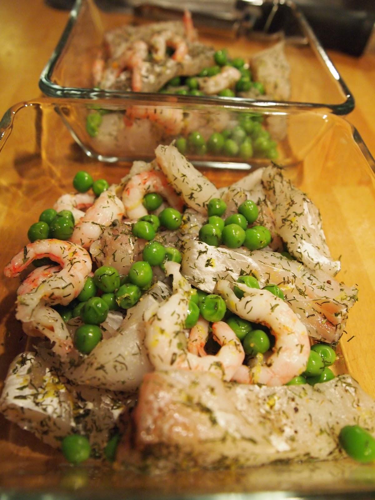Ställ in ugnen på 200 grader. Skala och dela potatisarna i mindre delar. Koka dem i lättsaltat vatten tills de är helt mjuka, prova med en sticka. Häll av vattnet och stöt potatisen till mos. Tillsätt mjölken och vispa potatismoset luftigt. Smaka av med en klick smör och salt. Förväll ärterna någon minut i kokande vatten (du kan använda potatisvattnet). Häll av vattnet. Skölj citronen, riv av det gula skalet på det finaste rivjärnet. Skär fisken i mindre bitar. Blanda i en skål räkor, ärter, rivet citronskal och finhackad dill. Salta och peppra.Smörj en ugnsfast form med en klick smör. Bottna med fisk och räkblandningen. Spritsa därefter potatismoset som ett lock, eller bred ut det med en spatel och gör ett snyggt mönster med gaffel. Grädda i ugn i cirka 40 minuter tills potatistäcket är gyllenbrunt och frasigt. Servera med sallad.