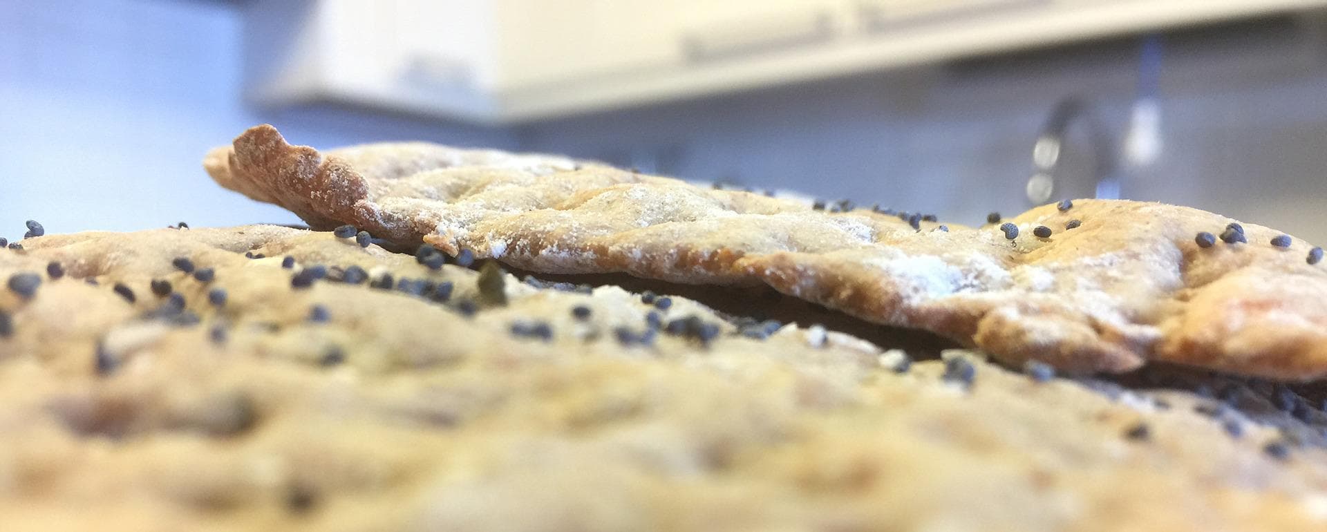 Ljumma mjölken, smula i och lös jästen. Tillsätt salt, kummin, fint rågmjöl och vetemjöl och arbeta degen tills den är blank och släpper bunken. Dela degen i 16 bollar, täck dem med en handduk och låt jäsa 40 min. Sätt ugnen på 225 grader. Kavla ut bullarna tunt och slutligen i grovt rågmjöl med kruskavel. Två kakor får plats på varje plåt med bakplåtspapper. Grädda 8-10 minuter. Låt svalna på galler utan duk. Förvara torrt.