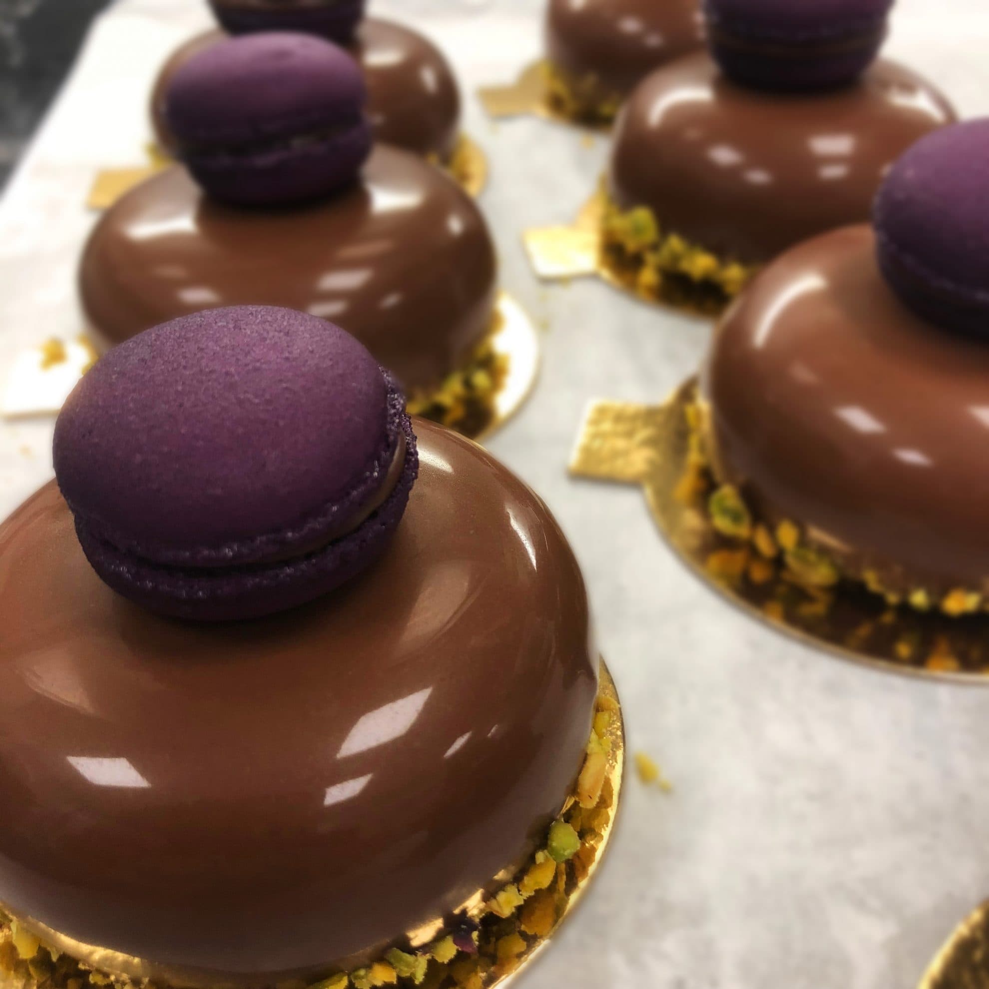 Koka upp grädde med glykos/honung. Häll över chokladen och rör slät. Tillsätt smöret och rör slät igen, försök att inte få in luft i smeten. Plasta ytan och ställ svalt tills ganachen är 34-36 grader. Viktigt att moussebakelserna är helt genomfrusna när man glaserar.
