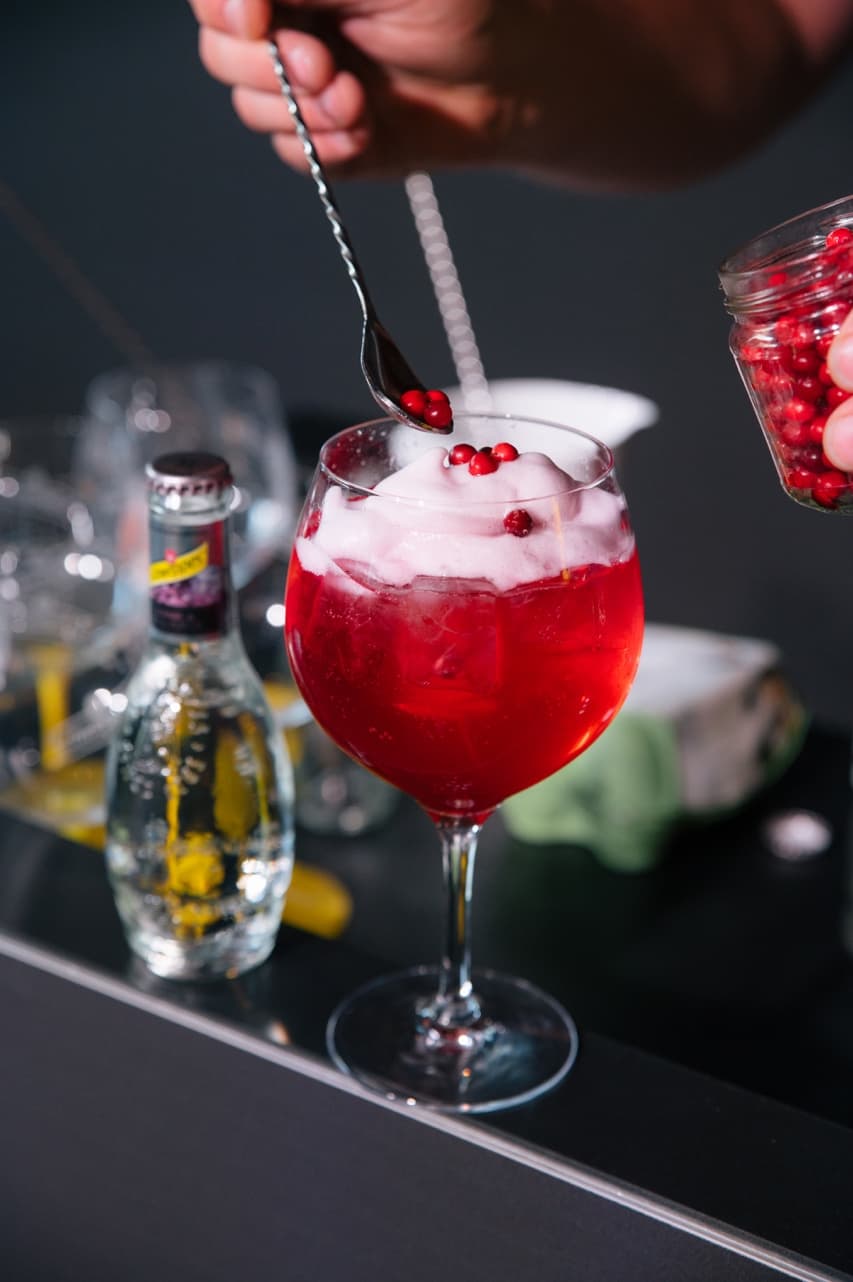 Placera en stor isbit i ett kylt glas. Häll i gin, lingondricka samt Schweppes Selection Mixers Tonic & Pink Pepper. Toppa med äggskum.