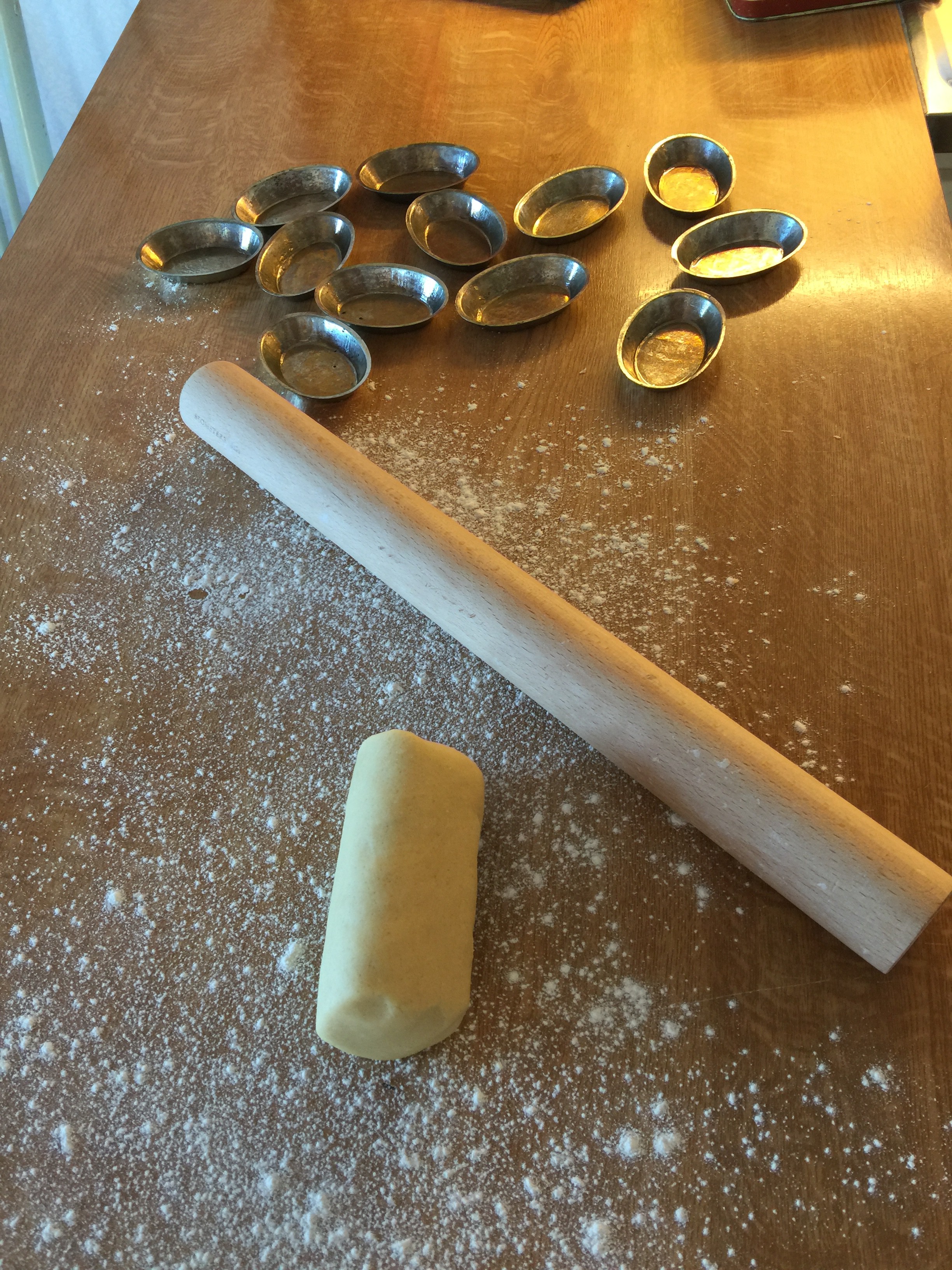 Gör nu mördegen. Sikta mjölet ner i en bakbunke. Klicka i smör och häll i socker. Arbeta ihop till en deg och tillsätt sedan ägget och blanda igen men bara precis så att ägget går in i degen. Knåda inte för länge. Plasta in degen och lägg den i kylen i minst 1 timma. Detta görs också med fördel dagen innan.
