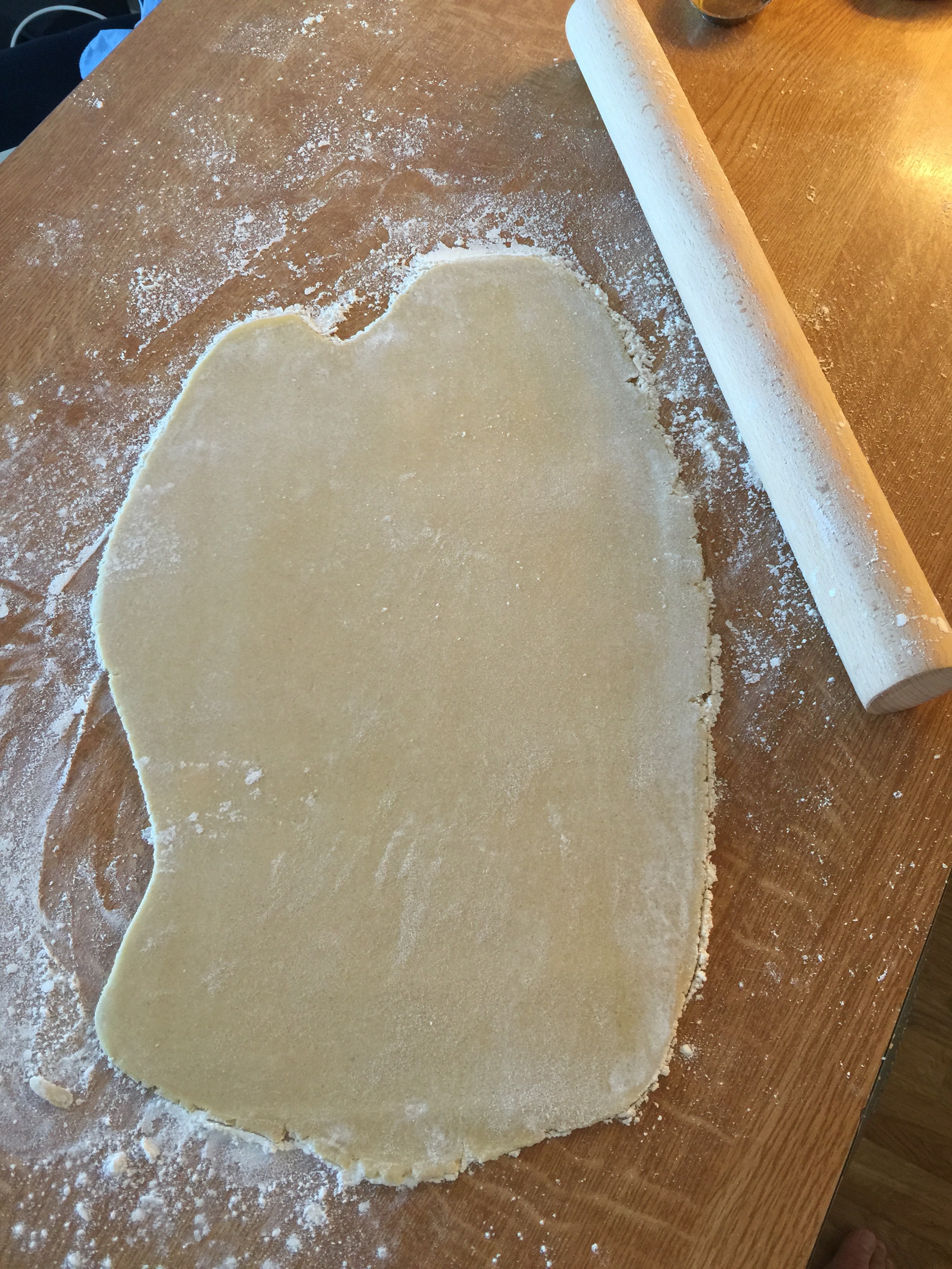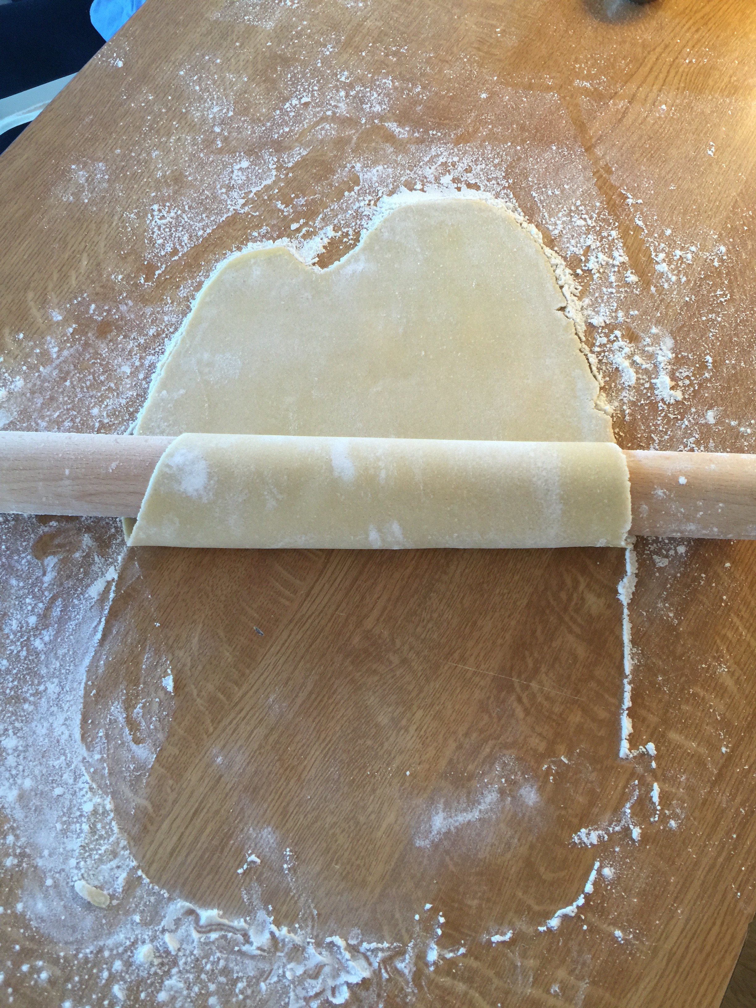 Rulla upp degen på kaveln och rulla sedan försiktigt ut den över de smorda formarna. Jag brukar göra hälften åt gången så blir det inte så mycket deg att jobba med.