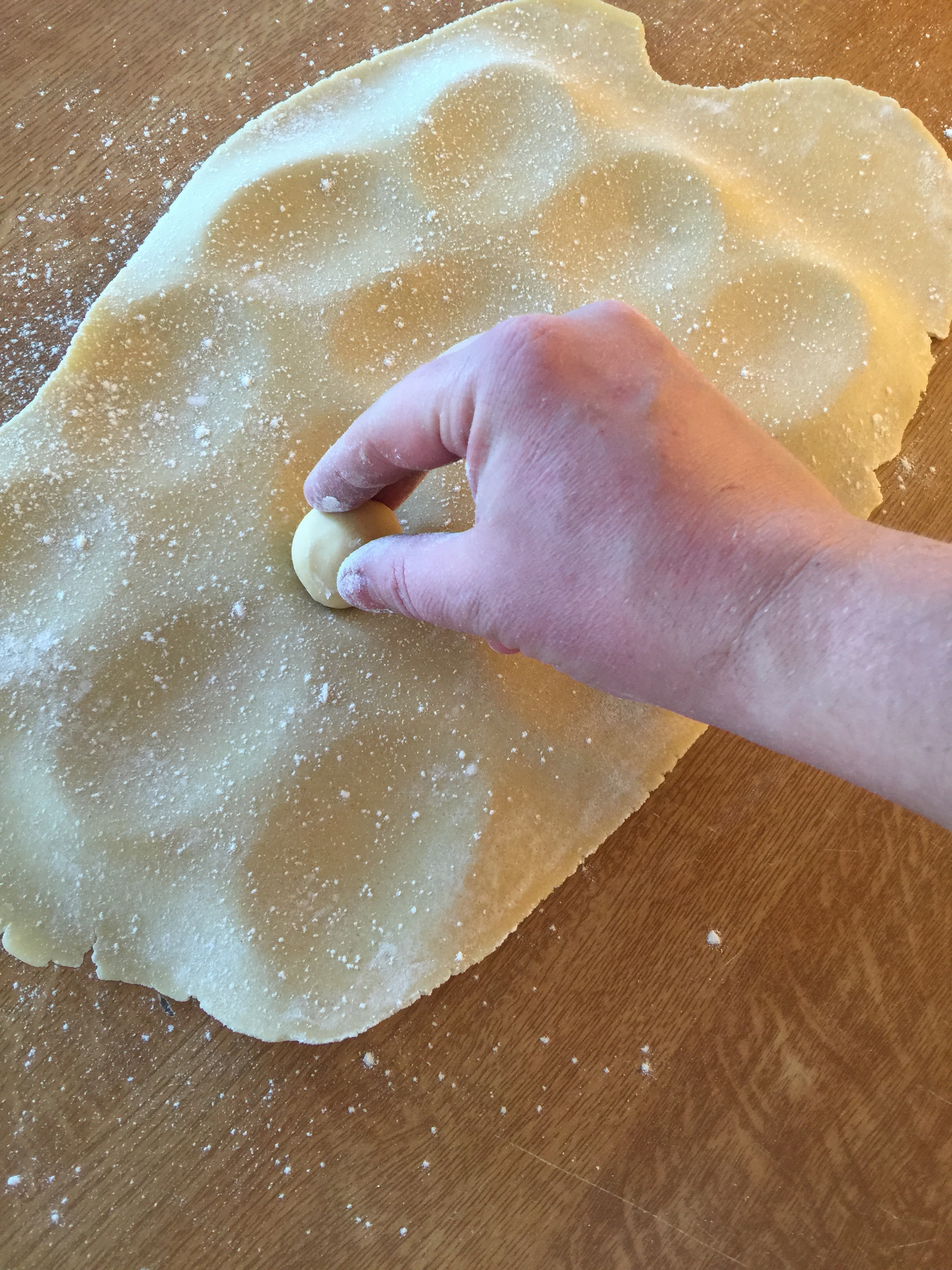 Pudra degen med lite mjöl. Dutta sen försiktigt ner degen i formarna med hjälp av en liten degboll. Spricker den får du lappa med lite deg bara.