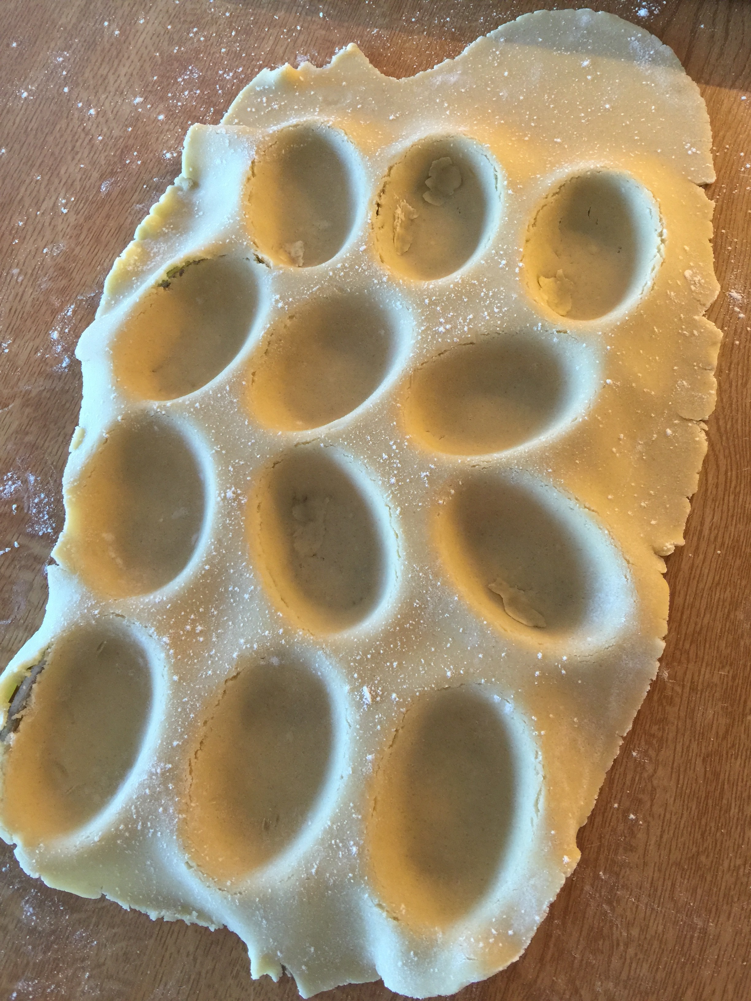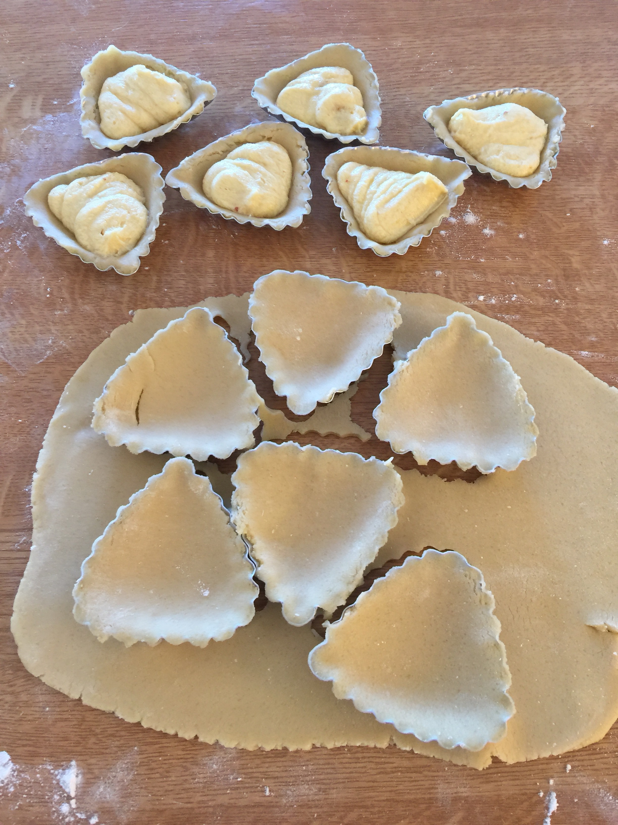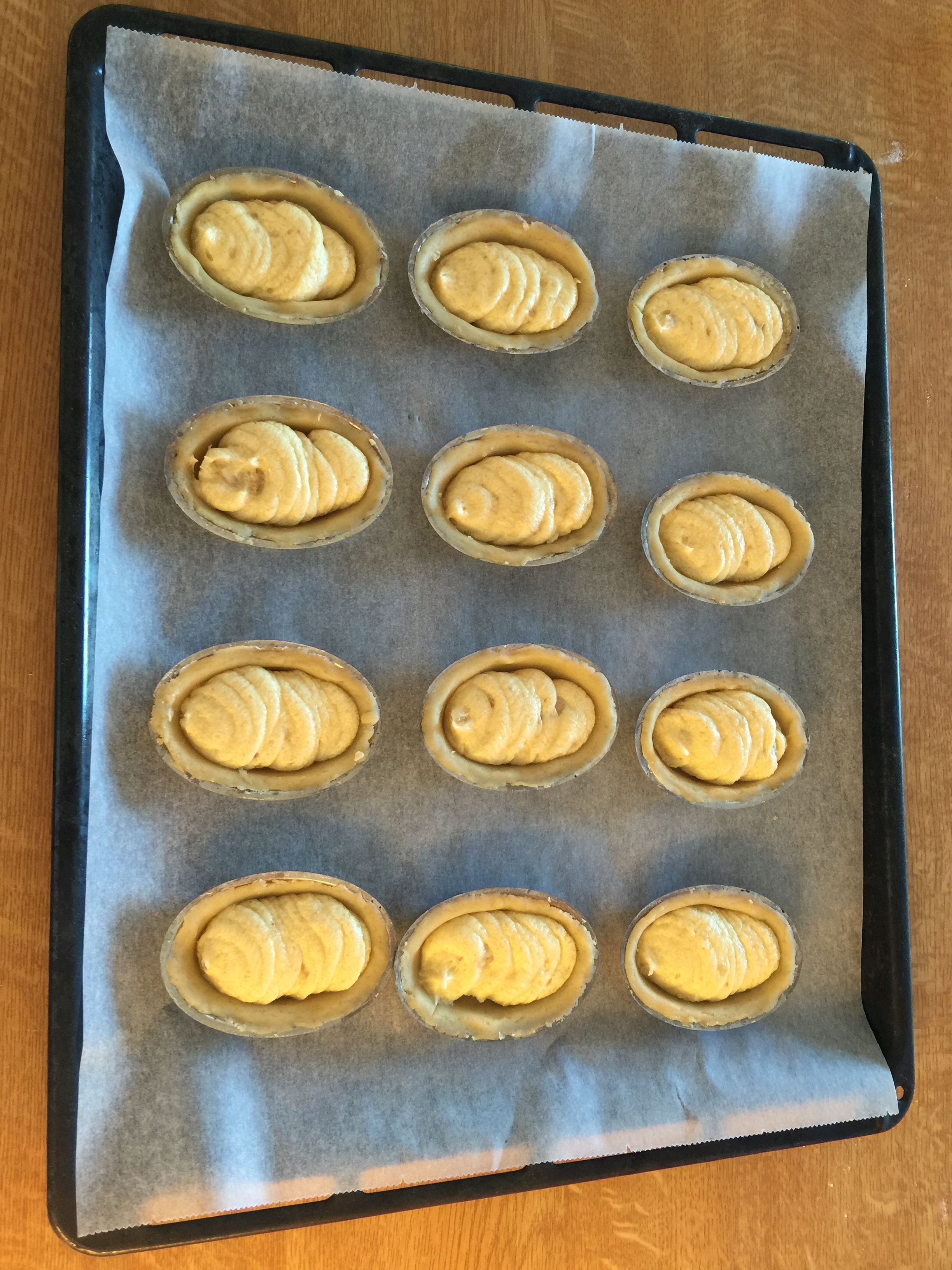 Sen trycker du med handen eller kaveln ovan på formarna så att degen lossnar. När det är gjort putsar du till kanterna om det behövs och sen fyller du formarna med mazarinfyllningen. ca 2/3 delar är lagom eftersom fyllningen sufflérar lite.