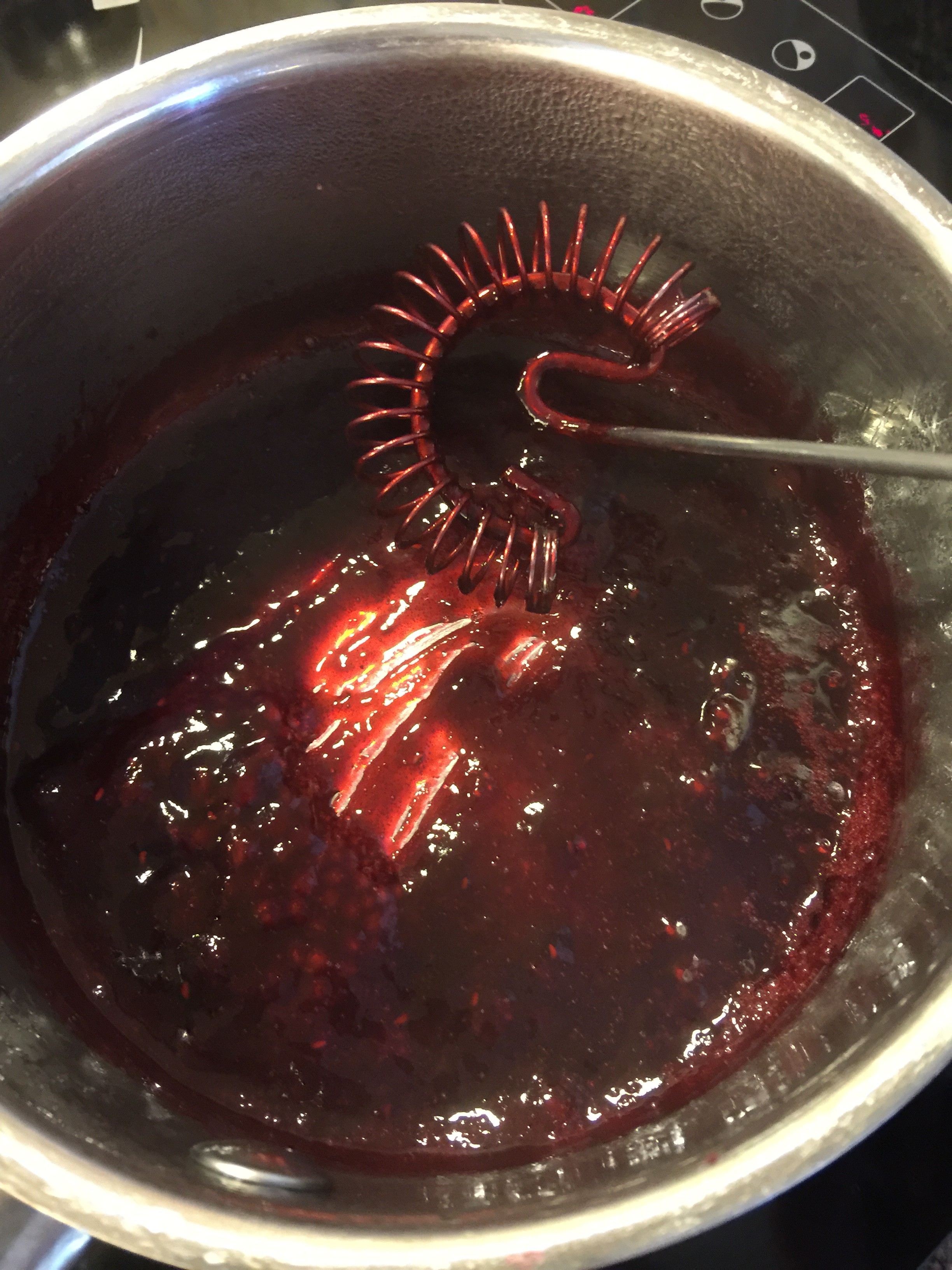 Börja med att koka hallonen och passera de genom en finmaskig sil så att kärnorna försvinner. Låt hallonpurén svalna och förvara den sen i kylen. Detta görs med fördel dagen innan