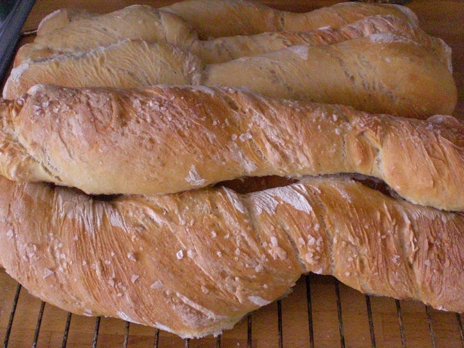 Lägg degen på mjölat bakbord och dela den i fyra delar. Forma till avlånga baguetter och lägg dem på en plåt. Pensla med vatten och gör fyra diagonala snitt på varje rulle med vass kniv (jag klippte mina med en sax). Låt jäsa under bakduk till dubbel storlek i rumstemperatur. Stänk över lite vatten och grädda bröden mitt i ugnen 20-25 min i ca 200 grader.