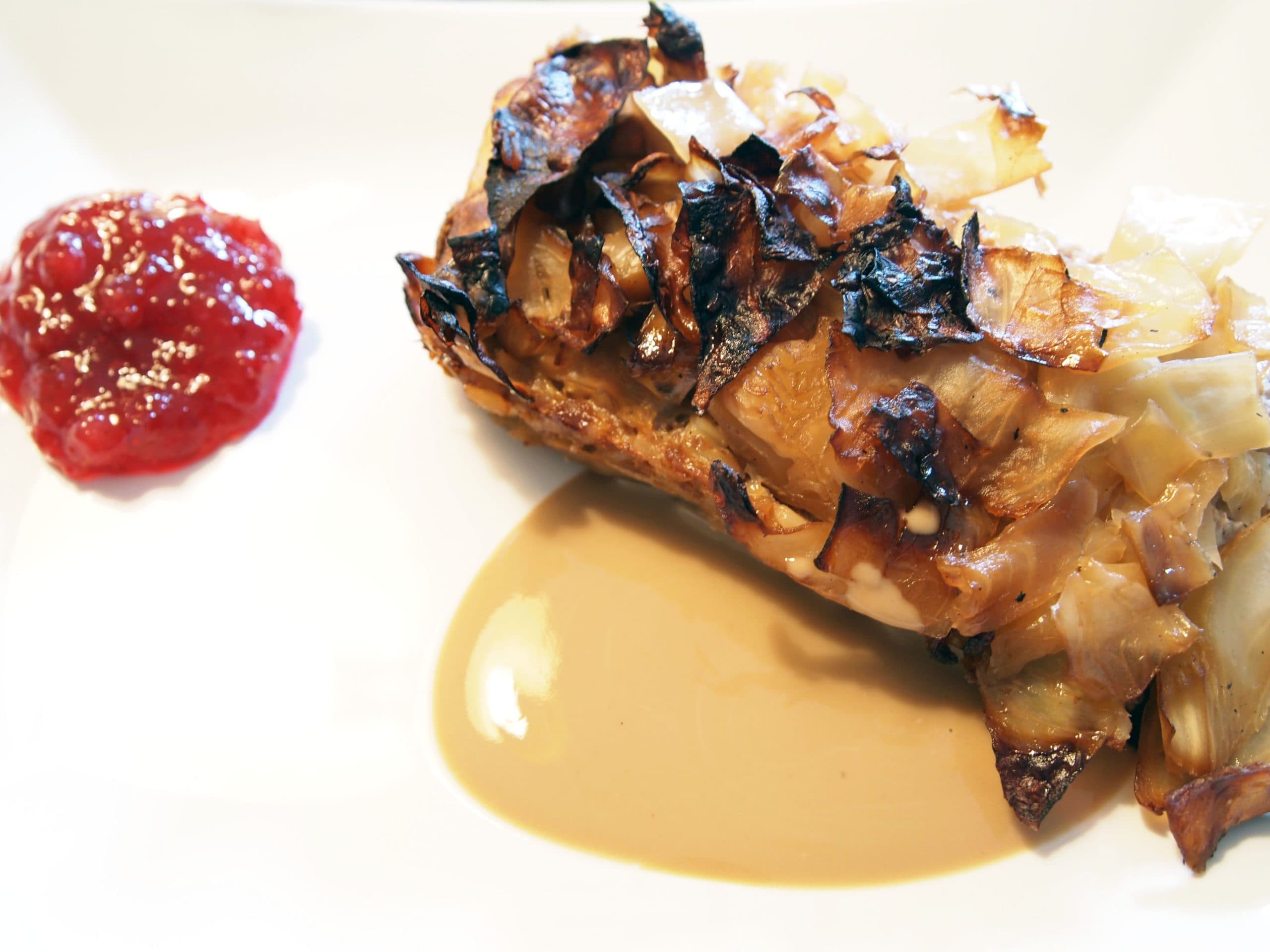 Skär bort stocken på kålhuvudet och skär sedan i små bitar. Fräs kålen i smör i en stekpanna. Ringla över sirap och salta. Stek länge tills kålen får färg och blir mjuk.