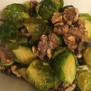 Blanda ihop brysselkålen och de saltrostade valnötterna i en serveringsskål. Ett bra lite matigare extra tillbehör vid (det gröna) julbordet.