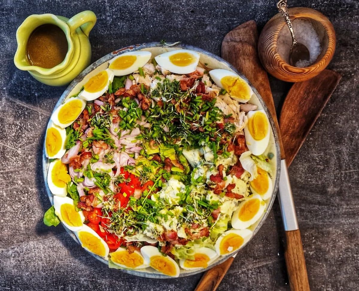 Skär tomater, kyckling och avokado i lagom stora bitar. Lägg på salladen tillsammans med roquefortosten, smula den i lagom stora bitar och rör om. Kvarta äggen och lägg på salladen tillsammans med löken. Strössla över med smulad bacon, den hackade gräslöken och vattenkrassen.