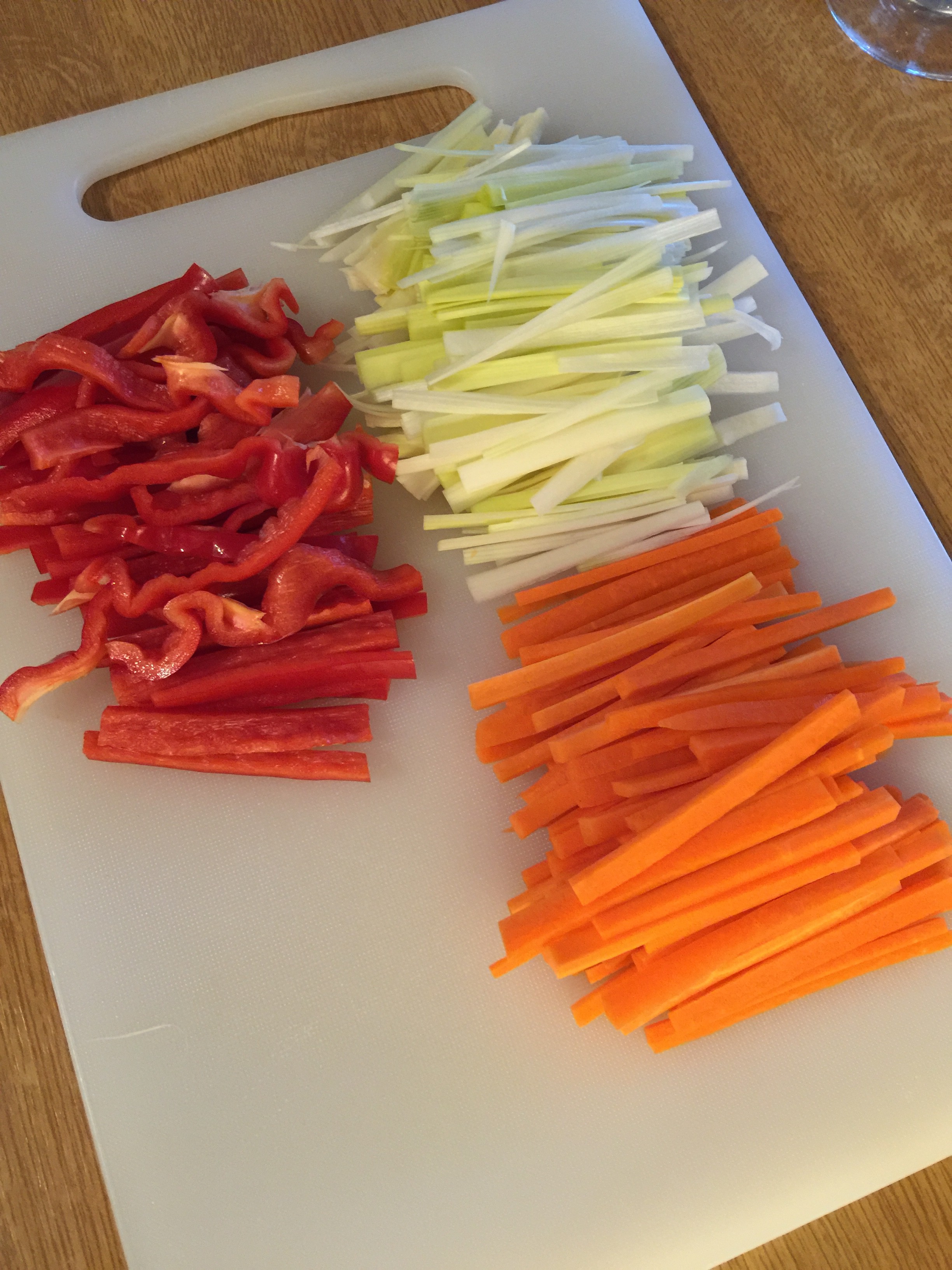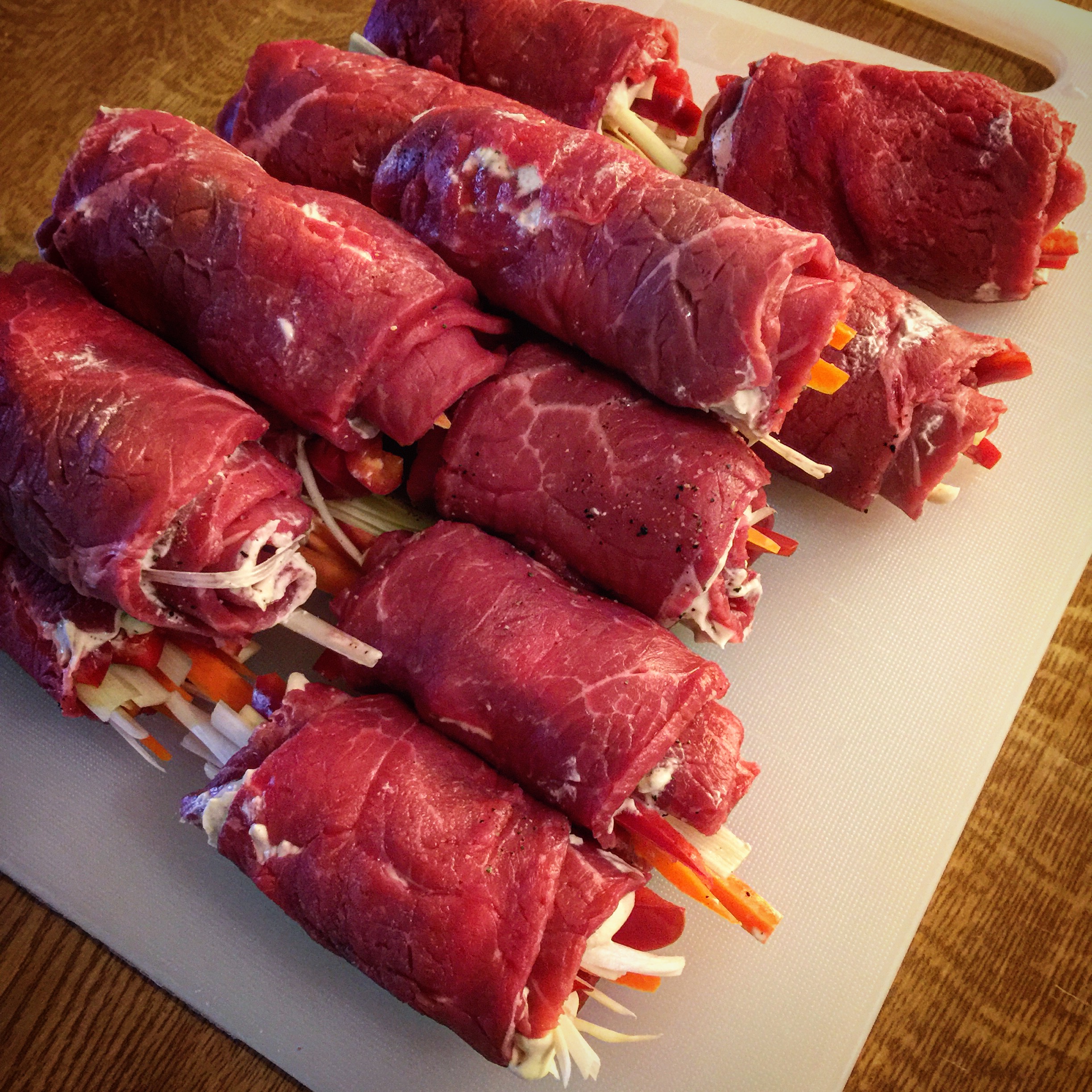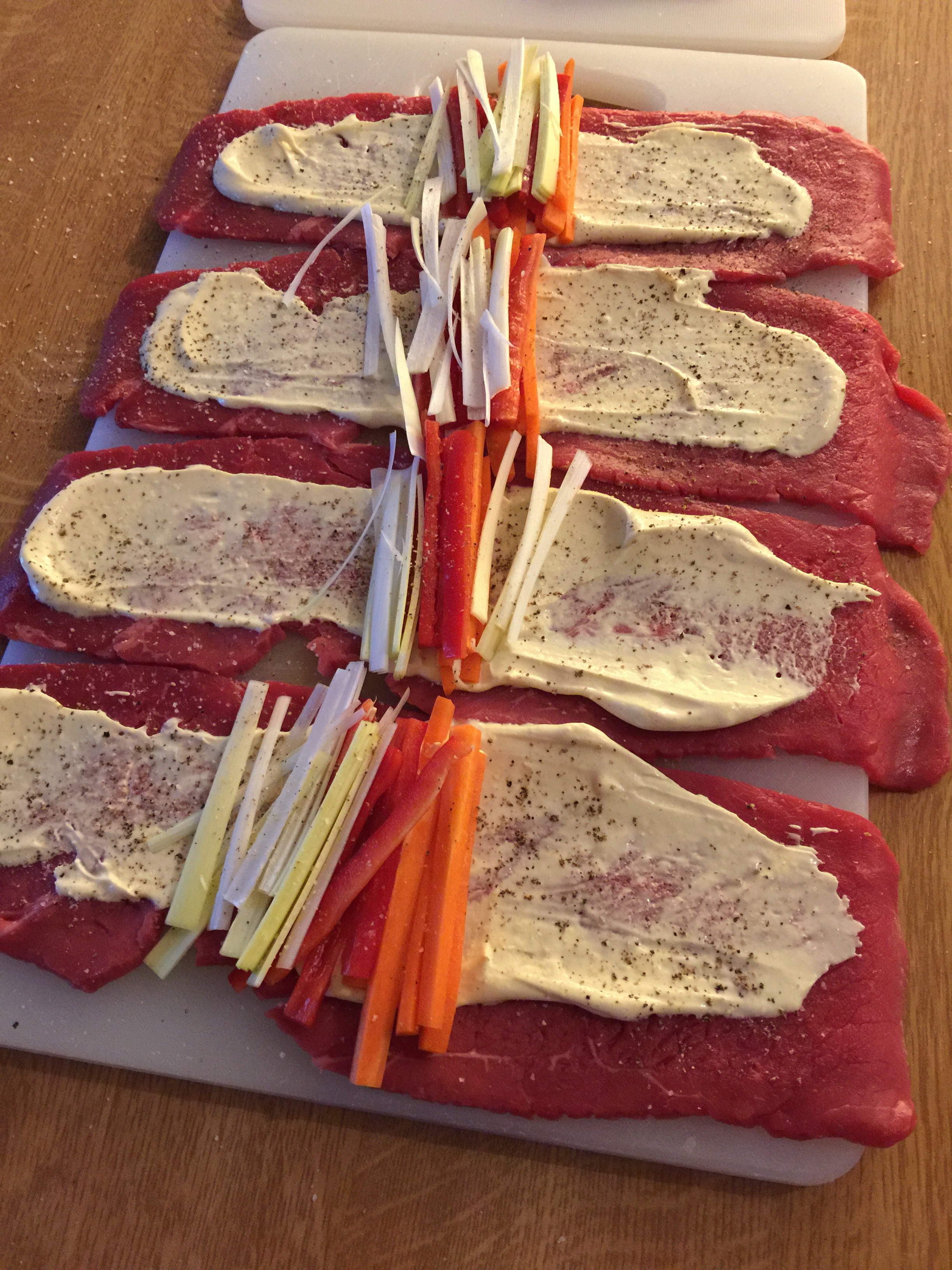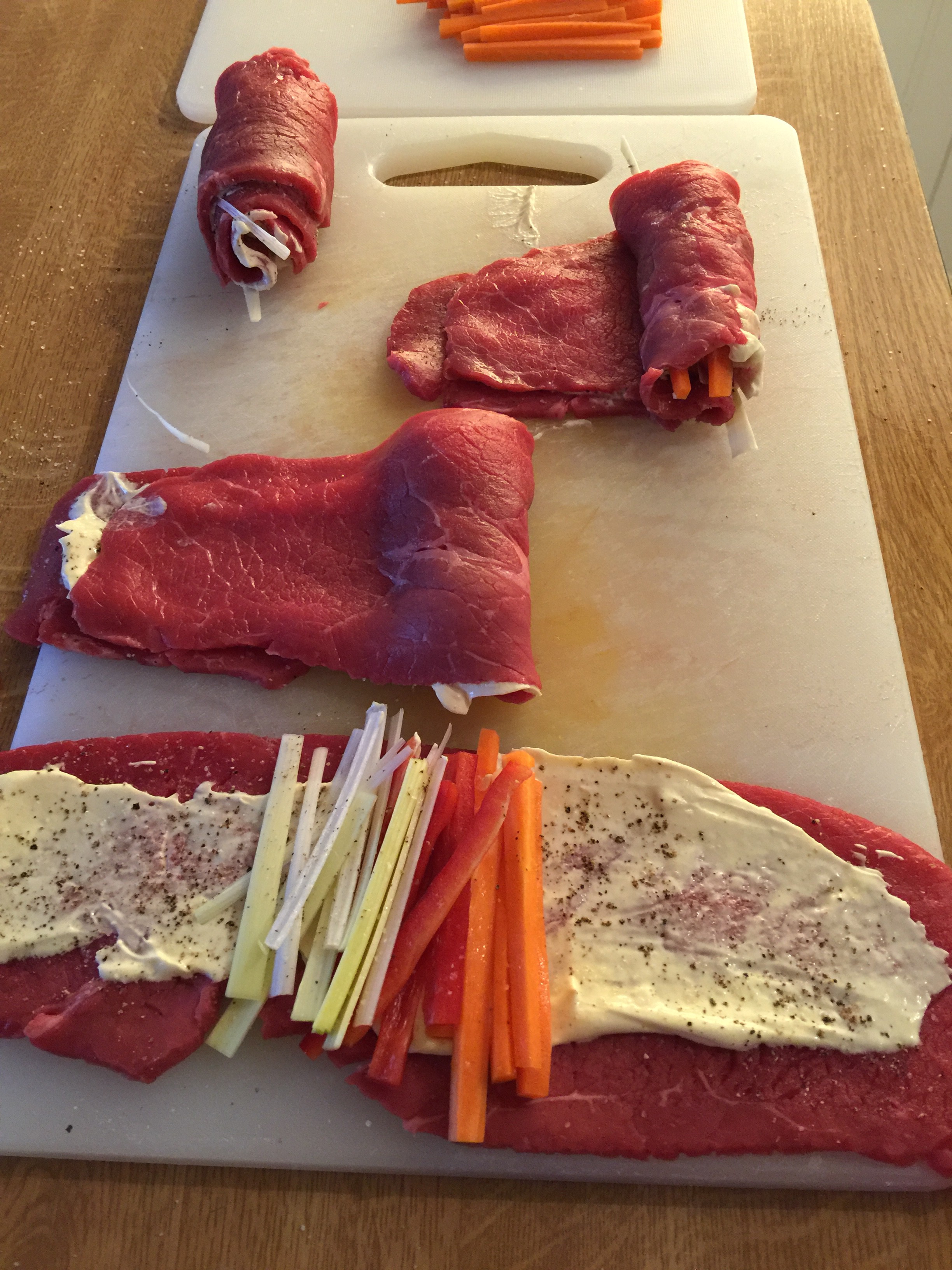 Strimla morot, paprika och purjo fint. Fyll lövbiffarna med de strimlade grönsakerna. Salta och peppra och rulla ihop de till rullader.
