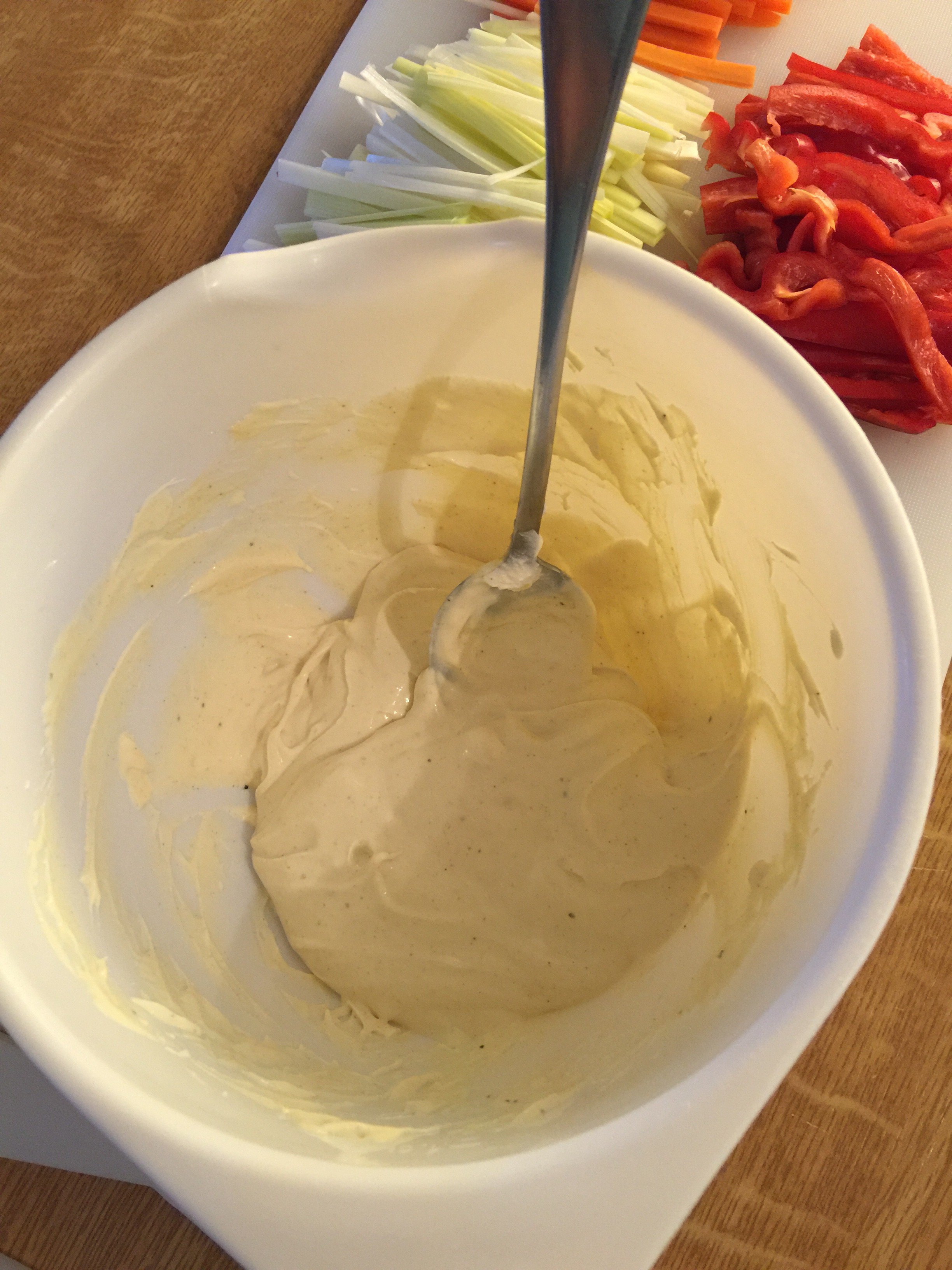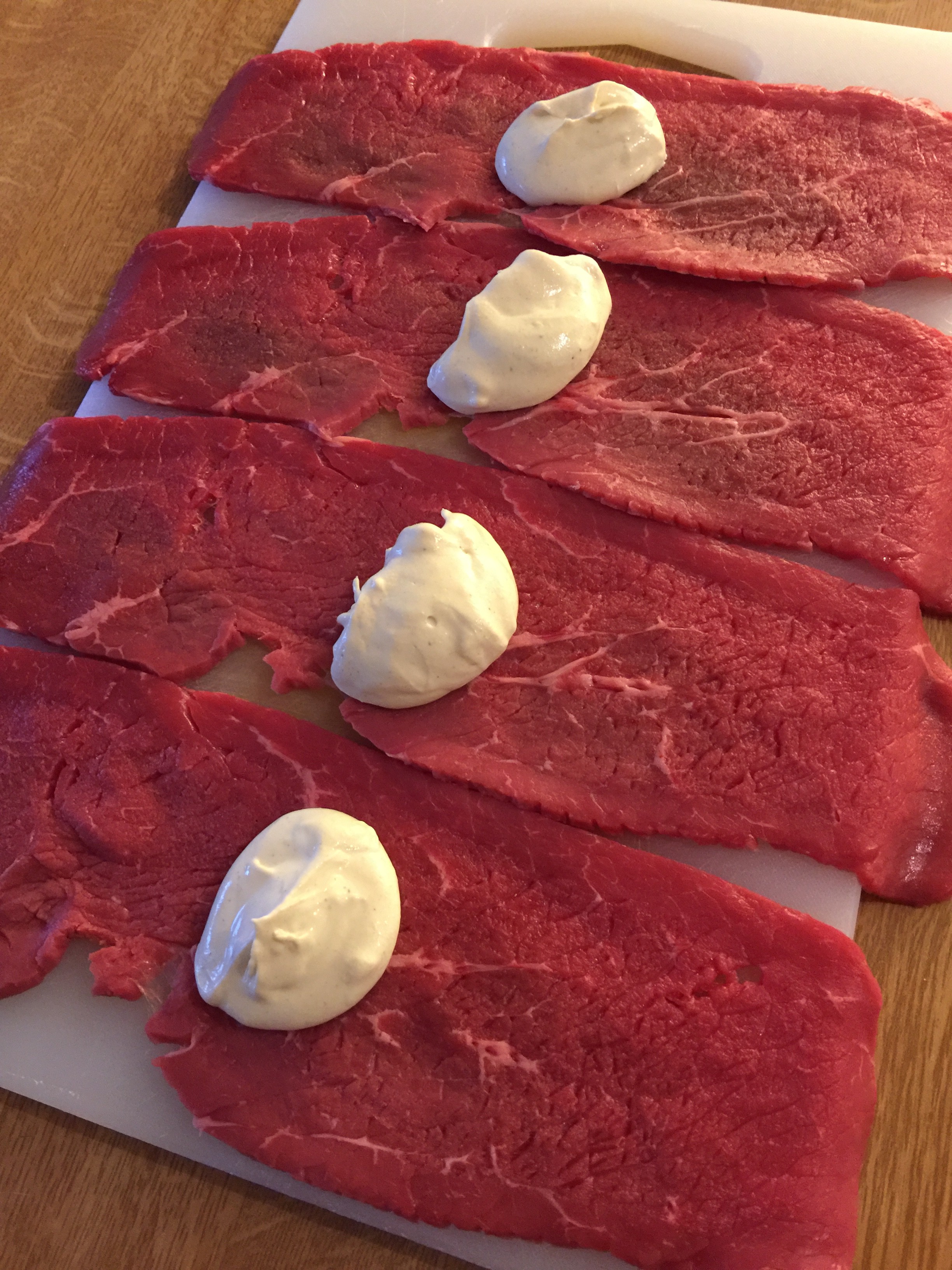 Börja med att blanda philadelphia, dijon och nymalen pappar till en creme. Bred sedan ut ett par msk crème på varje lövbiff.