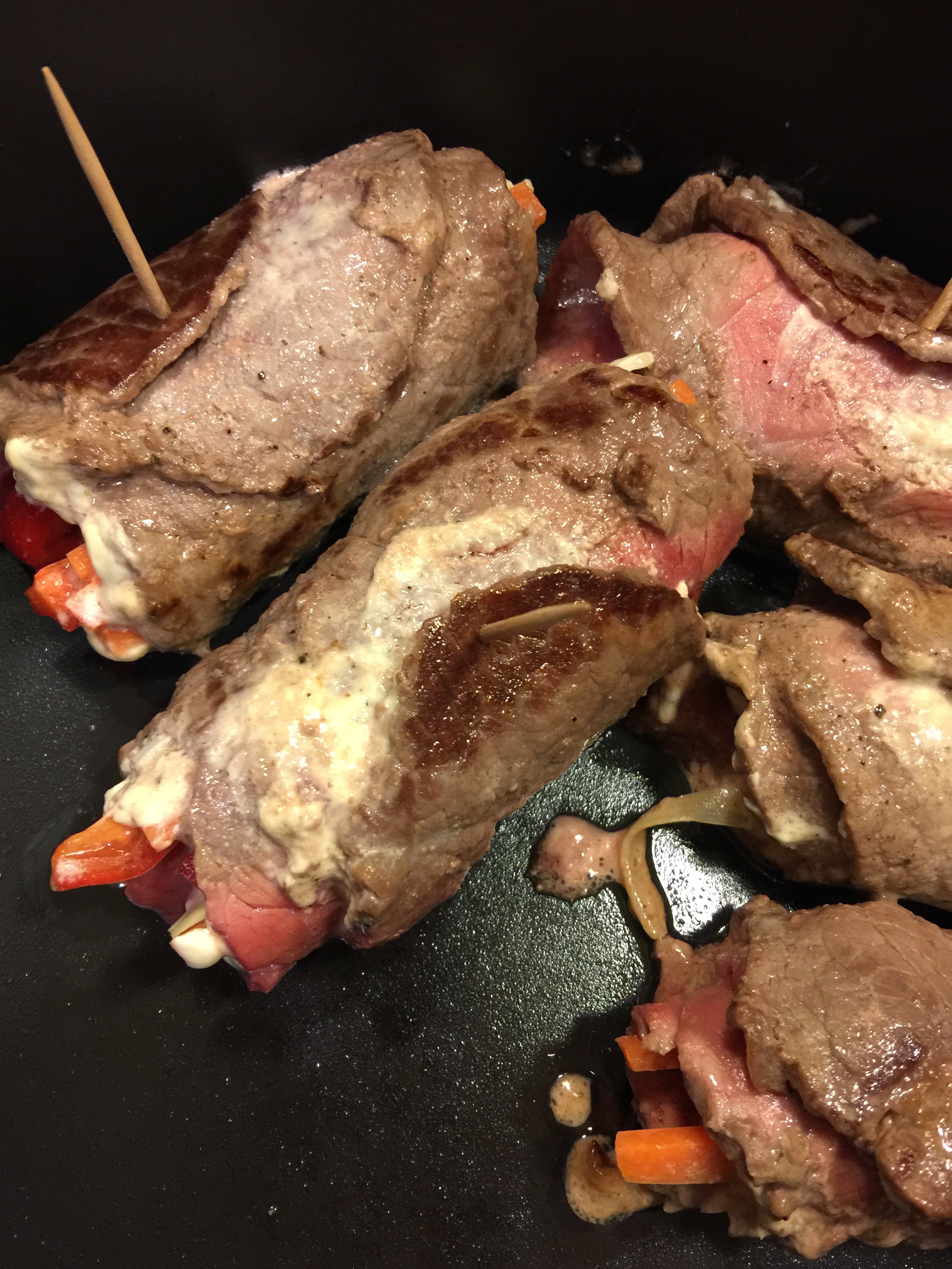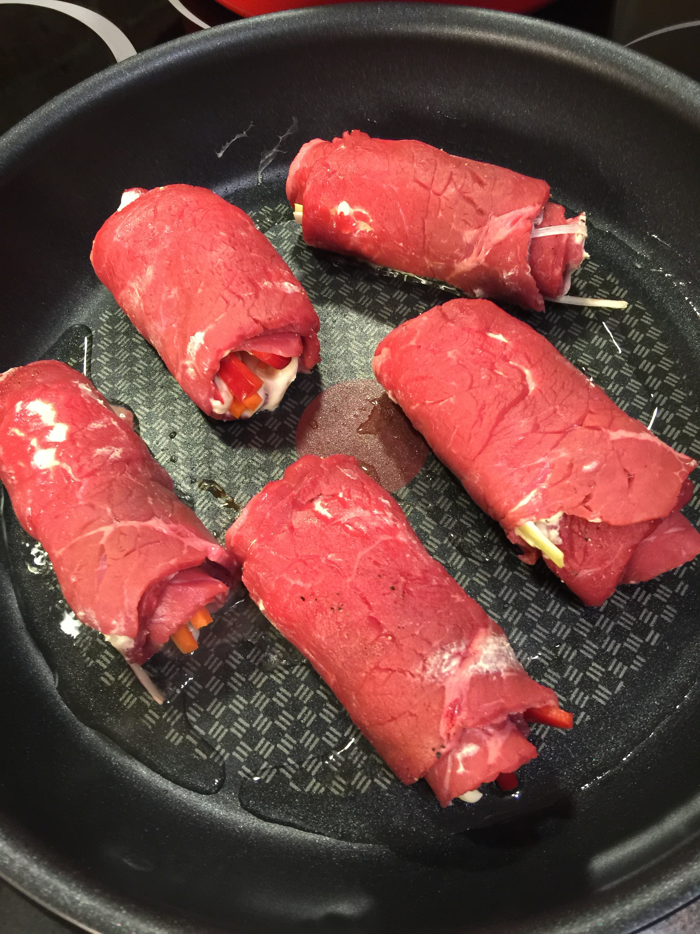 Stek sedan rullederna i smör och rapsolja tills de fått en fin stekyta runt om. Vill man kan man ”sy” ihop rulladerna med en tandpetare så att de inte öppnar upp sig när man steker dom. Flytta sedan över de färdigstekta rulladerna till en gjutjärnsgryta.