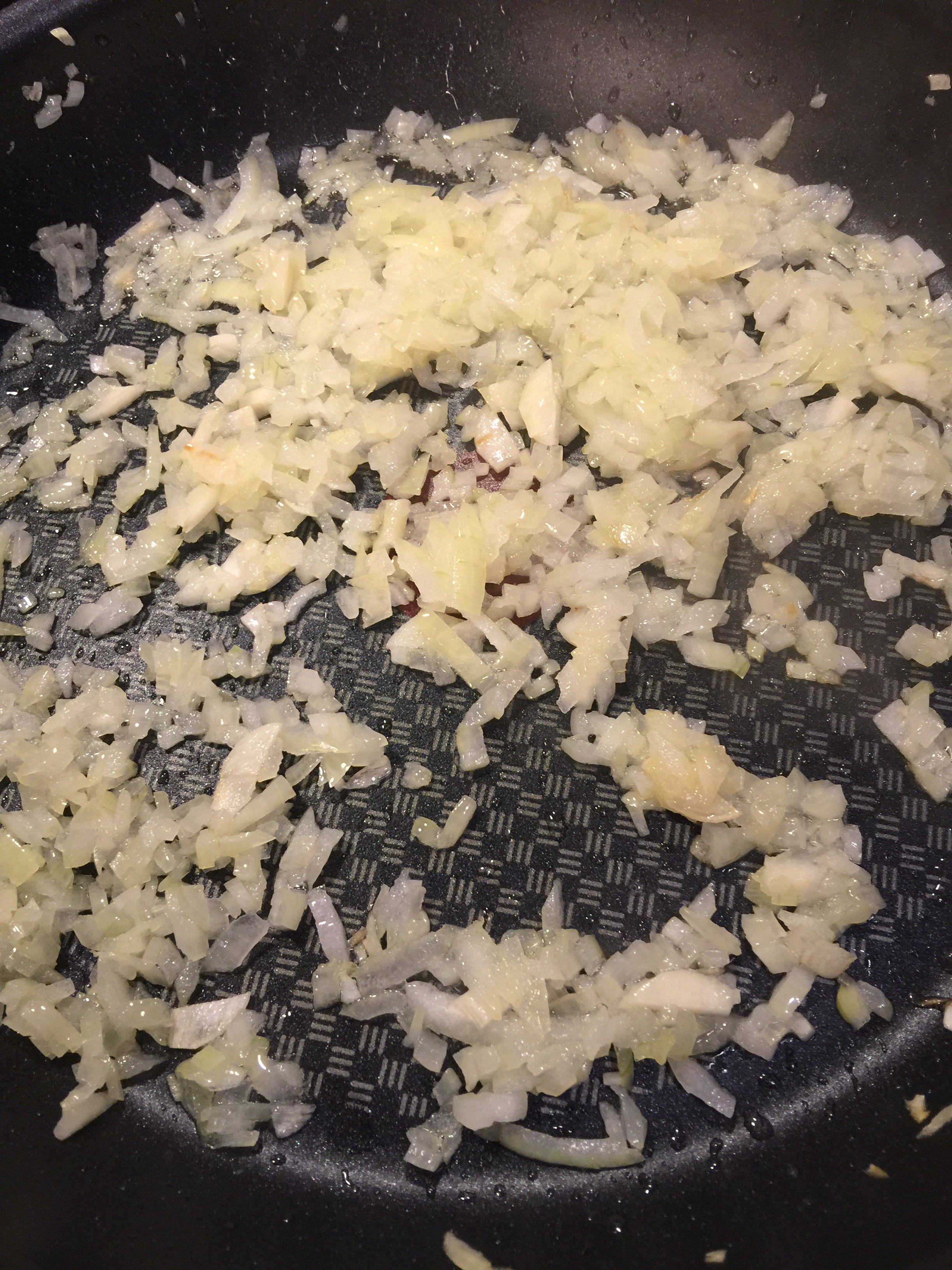 Nu är det dags att göra såsen. Finhacka lök och vitlök. Torka ur stekpannan och stek löken på medelvärme i lite olja tills den är mjuk men inte fått färg.