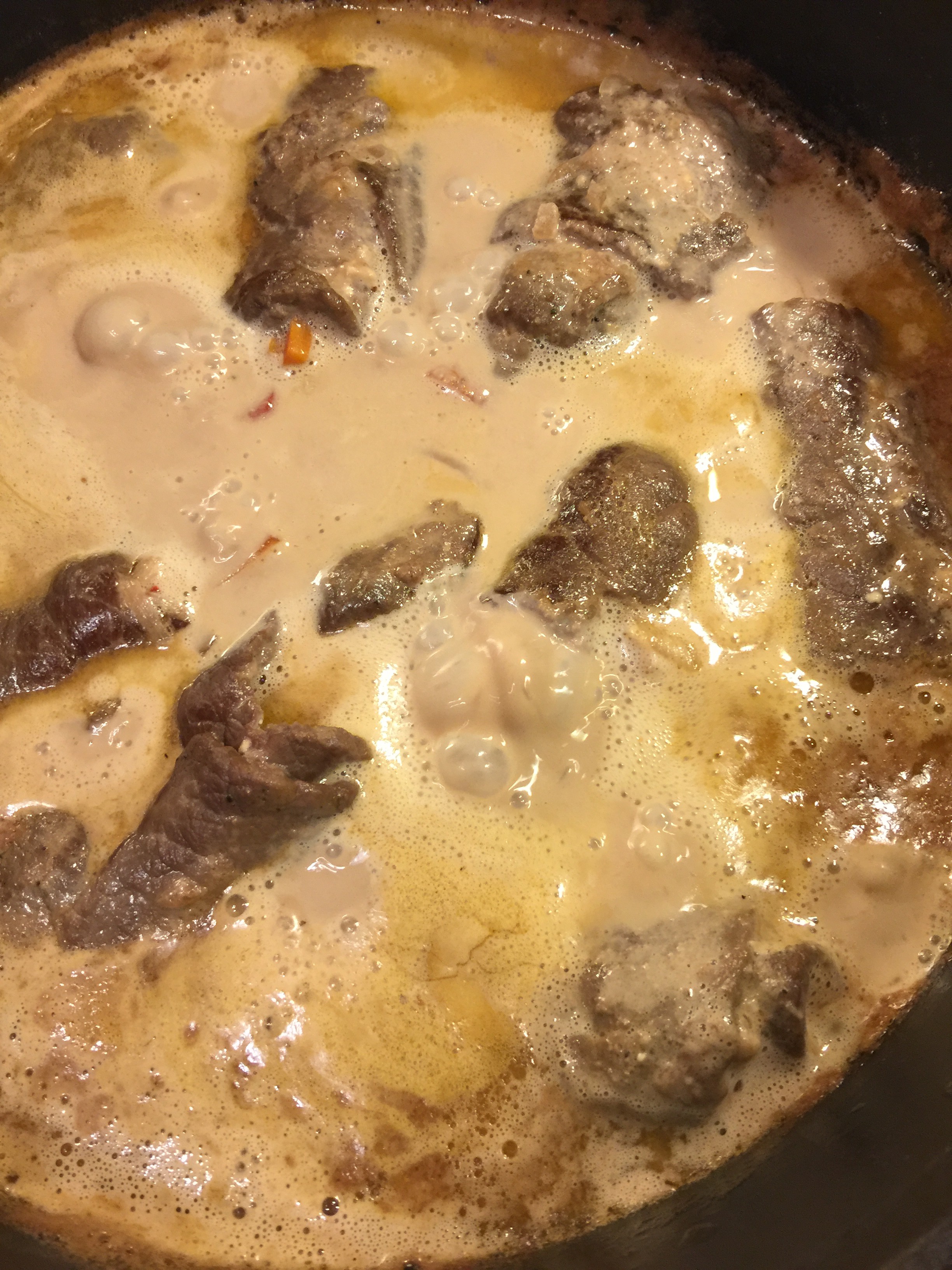 Häll sedan såsen över köttet i gjutjärnsgrytan och låt det puttra utan lock i ca 90 minuter tills såsen är krämig och köttet mört.