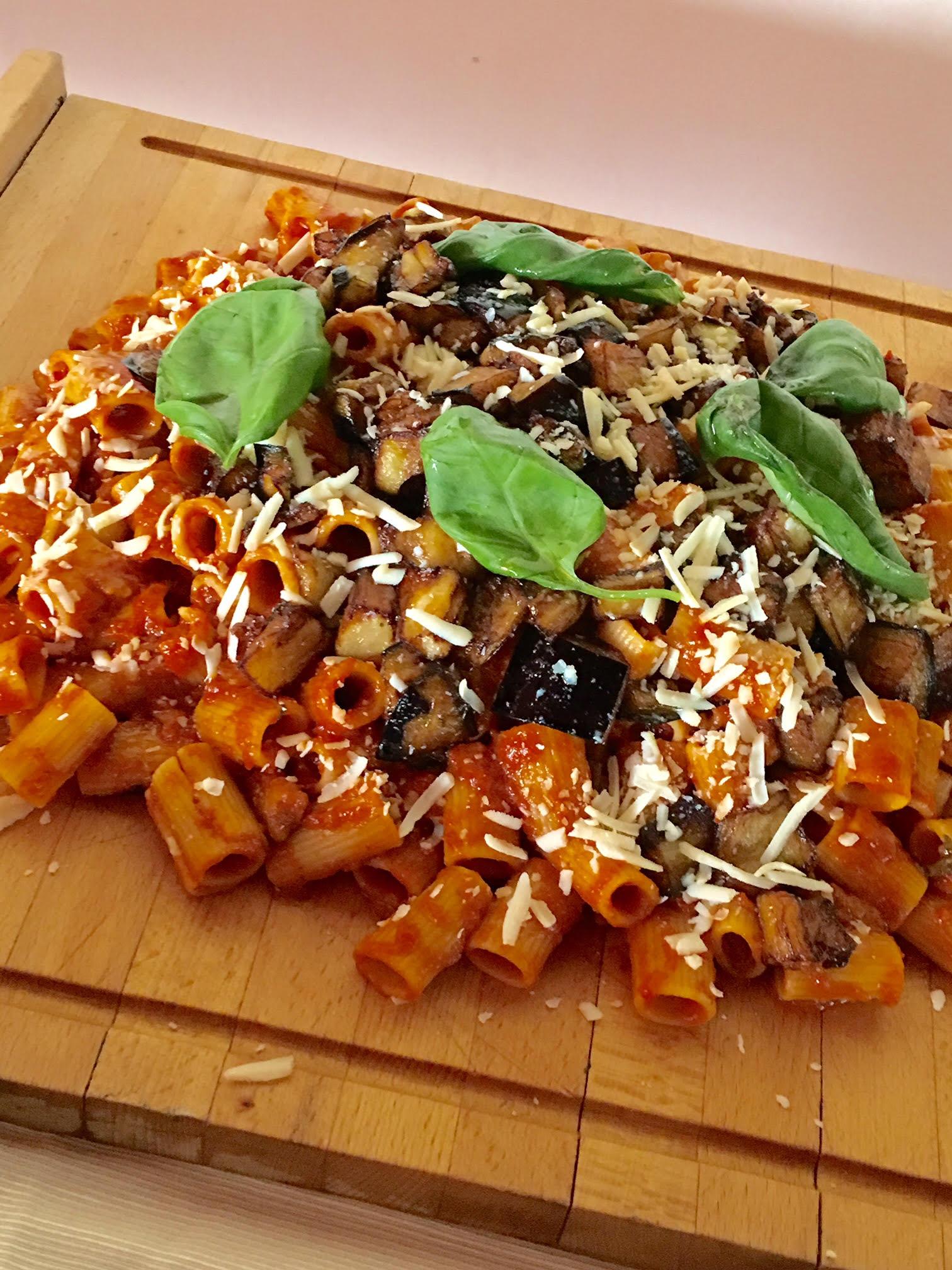 Smaka av tomatsåsen med salt och peppar och vänd ned den nykokta pastan i tomatsåsen, använd gärna en skvätt pastavatten om det känns torrt. Toppa med den stekta auberginen och rör om försiktigt.