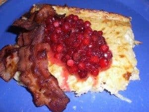 - Stek baconet. Låt rinna av på hushållspapper. Stick ner baconskivorna i smeten. Grädda mitt i ugnen ca 30 minuter eller tills ytan är knaprig och har fått vacker färg.