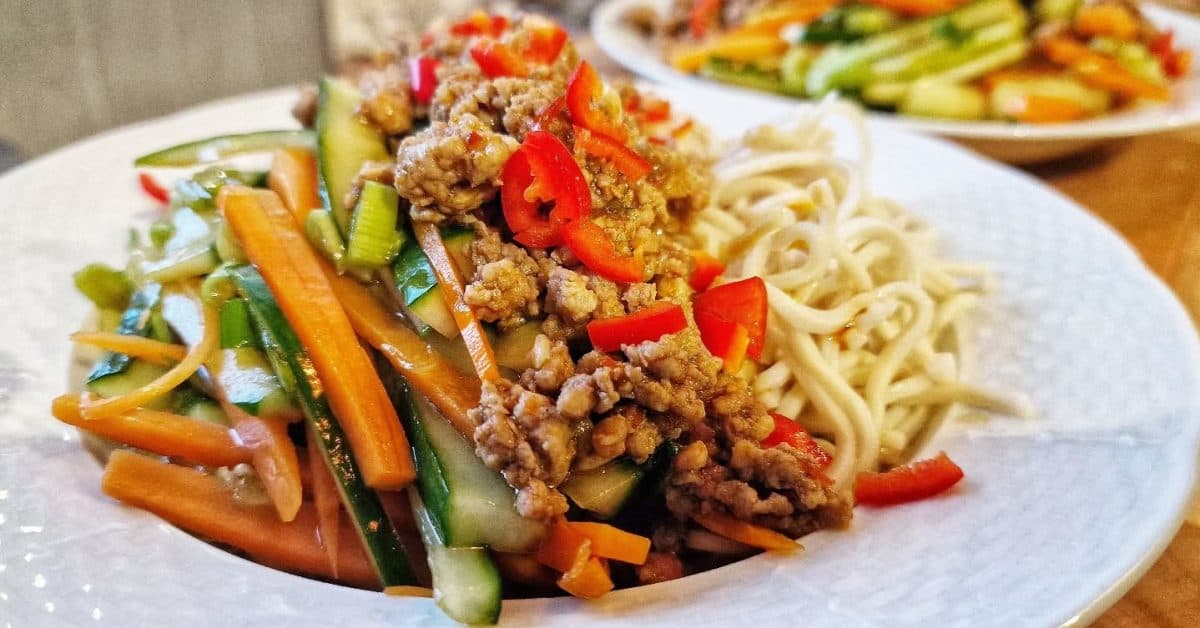 Zhajiang mian är en rätt från Beijing, det finns dock också en variant av denna från Sichuan som är hetare. Jag har tagit inspiration av Fushia Dunlop och några andra när jag satt ihop mitt recept så detta kan sägas vara min variant av rätten. Den är förhållandevis het så om du vill du göra den mildare så använd lite mindre chiliolja, byt ut till exempel ut delar av den mot raps- eller solrosolja och använd en mildare bönpasta.
