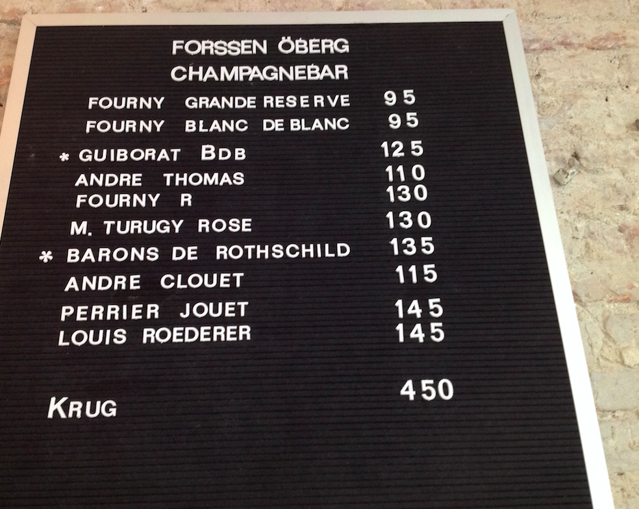 Ett genomgående tema är att det inte är speciellt dyrt att beställa in en helflaska Champagne framförallt om man jämför med vad du får betala i Stockholm kring Stureplan. Forssén & Öberg har sin styrka på vinsidan framförallt på Champagne tycker jag. Det är ett stort och brett urval av både kända och okända producenter. Ja du kan beställa både Krug och Selosse om du vill men även mer okända producenter. Många viner finns att tillgå på glas. Exempelvis kan man beställa in den utmärkta Blanc de Blancs från utmärkta champagneproducenten Fourny för 95 kronor, en helflaska kostar måttliga 495 kronor. Vid ett besök med min familj beställde jag in två helflaskor av bra skumpa och notan landade på under tusenlappen. Jag blev faktiskt överraskad av hur prisvärt det kändes. Jag är väl skadad av min hemstad dessvärre.