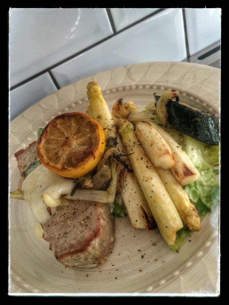 Jag för alltid massor av spännande diskussioner med människor om mat. Många är kunniga och intresserade, funderar på vad de stoppar i munnen och hur det påverkar vår jord. En del andra kör så det ryker, har ett helt annat sätt att tänka, och är inte det minsta intresserade av att äta bra saker. Jag tycker att det man äter måste väljas med omsorg så när jag hittade en bra tonfisk så blev jag glad. Här på WVF´s sida kan du hitta information om vilka fiskar som det är OK att äta. När det gäller just tonfisk så skall man försöka leta efter de som är spöfångade, dels för att det är ett mycket mer skonsamt fiske. Och dels för att man då slipper att få delfiner i fångsten, de simmar gärna med tonsfiskstimmen och kvävs och dör när de fastnar i näten. Det finns några arter man absolut skall undvika och det är den blå- och gulfenade det finns inte många av dem kvar i världshaven. Men Albacroe och Skipjack är två sorter som är ok att äta. De är mindre i storleken och har ett något ljusare kött och kallas därför för vit tonfisk. Mitt bästa sommar recept är en grillad tonfiskfilé med grillad citron, sparris och en sallad som påminner om en Cesarsallad. Prova vetja, det är gott! Om du har svårt att hitta bra vit sparris så går det lika bra med svartrot eller palsternacka.