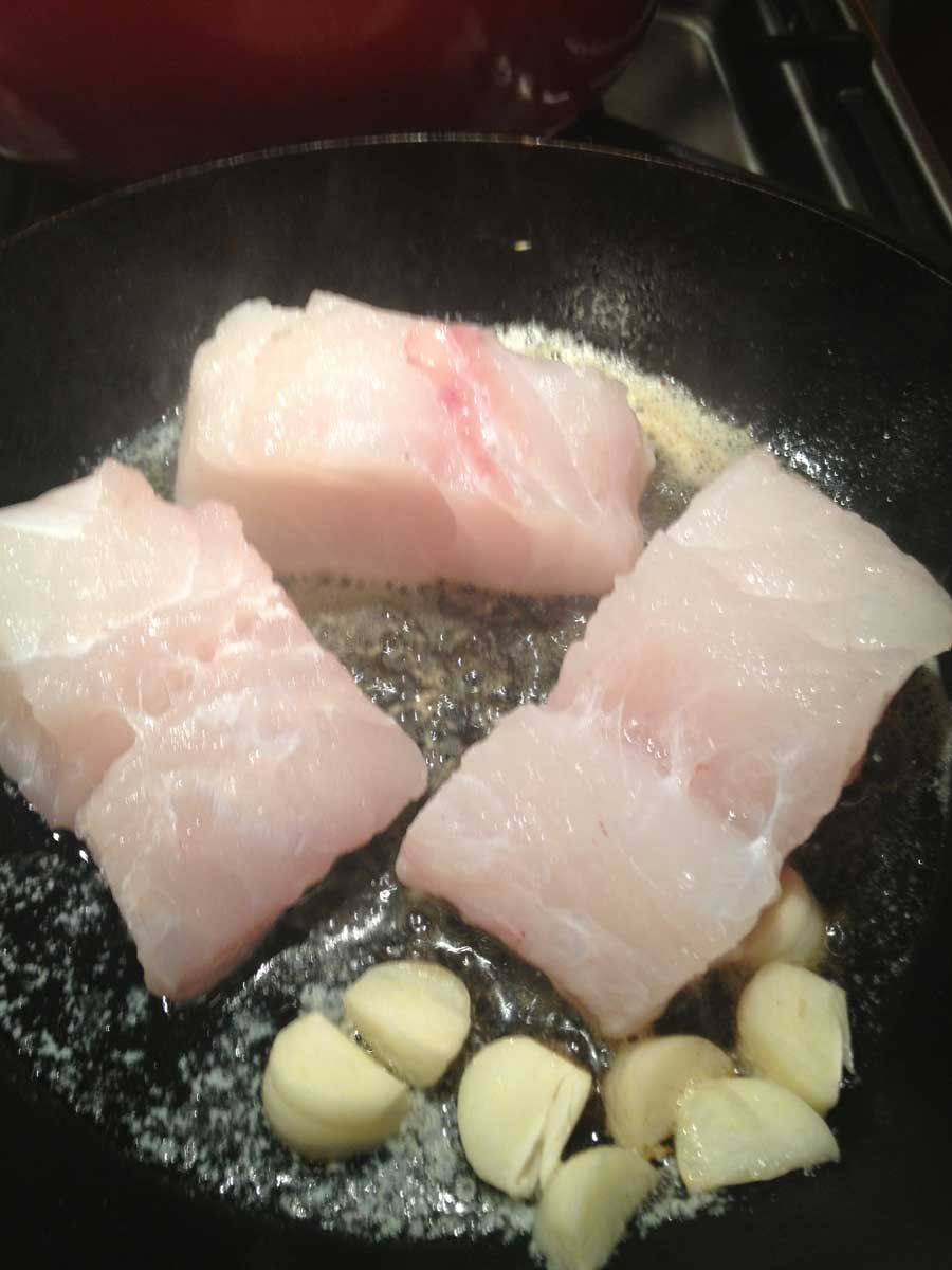 Låt din stekpanna bli riktigt varm, lägg i smör och en skvätt olivolja. Lått vitlöksklyftorna och timjankvisten ligga och gosa i den varma smöret. När smöret slutat låta lägger du i fiskbitarna med skinnsidan nedåt. Låt dem gå i cirka 3 minuter, du ser att fisken har börjat ändra färg. Vänd fiskbitarna försiktigt och låt dem få färg på kött sidan också, salta och peppra fisken och lägg den på en bit papper medan en stund.