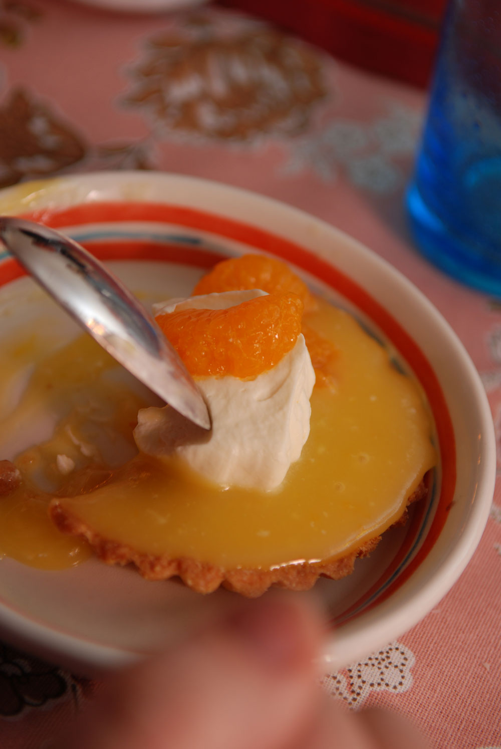 Häll saften i en kastrull blanda ner allt utom smöret och låt det småputtra på ganska svag värme. Har du för varmt blir det en apelsinsmakande äggröra – det vill vi inte. När det blivit varmt lägger du i smörbitarna och fortsätter röra tills det blir en tjock kräm. Låt den svalna och använd som kräm i en mandelmussla eller som pålägg till en skorpa och en kopp the.