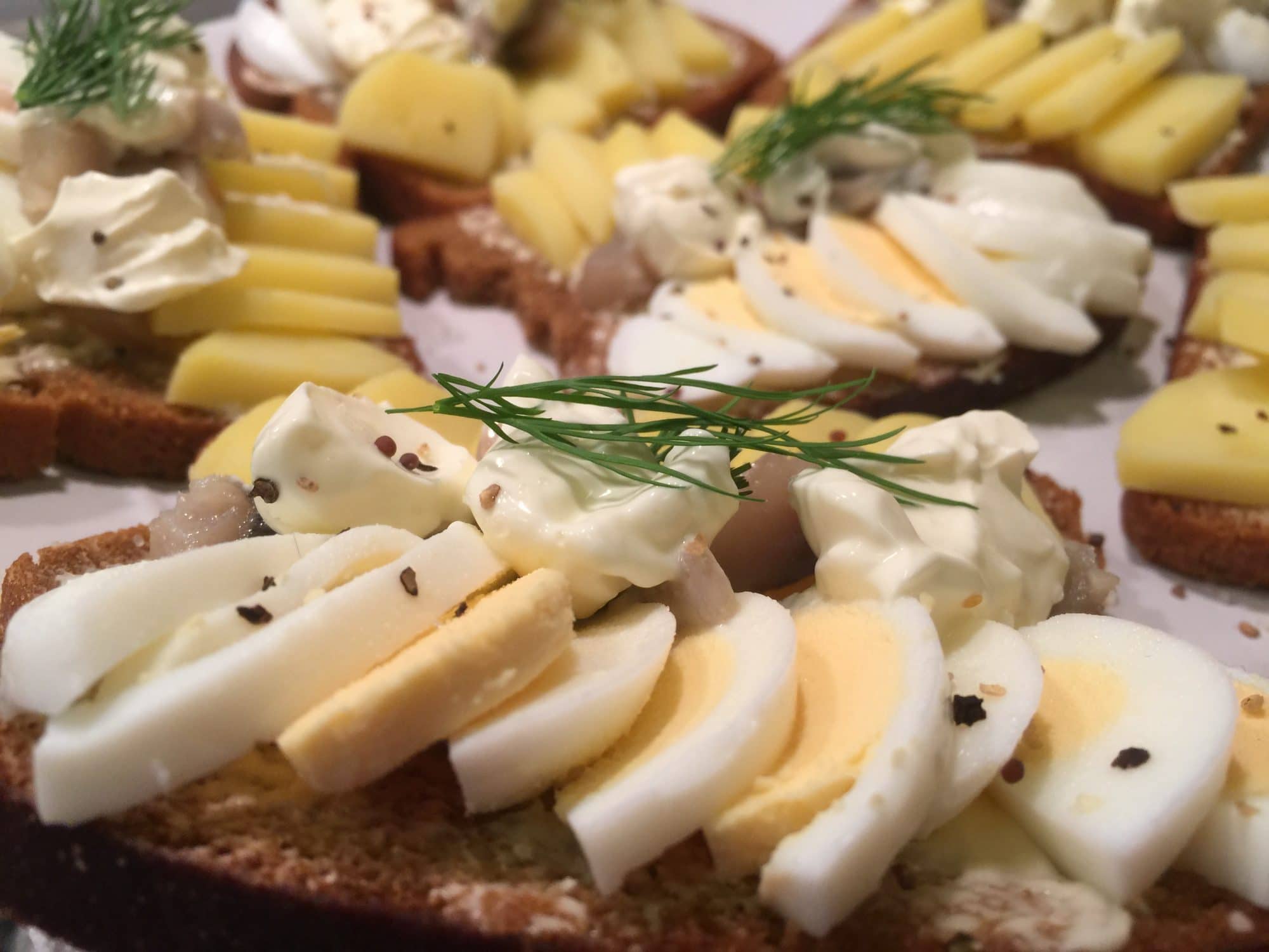 Av sill, ägg och överbliven kokt potatis kan man göra underbara danska smörrebröd. Använd julbrödet, vörtbrödet eller kavringen. Bred smör på smörgåsen. Skiva ägg, potatis och valfri inlagd sill, matjessill eller ansjovis. Lägg i tre rader så det täcker mackan. Toppa med crème fraîche, gräddfil eller smetana samt gräslök eller dill. Dofta lite salt och mal svartpeppar över.