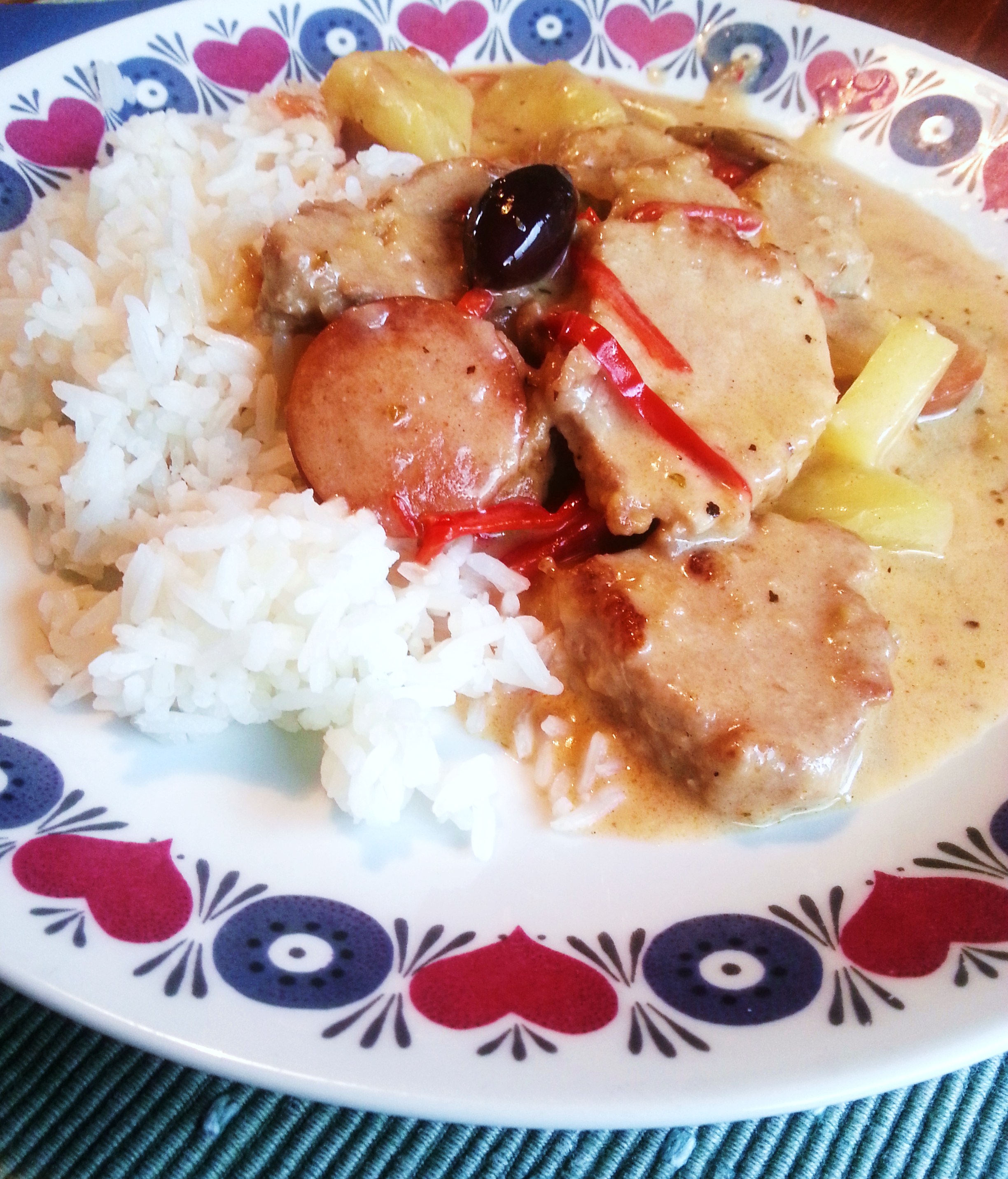När man är gäst kan man ju inte alltid själv välja och vraka bland råvarorna utan man måste anpassa sig till andras smak och lust. Idag stod fläskfilé på att-göra-listan, så då var det bara att klura ut något som kunde bli gott med detta. I detta syfte satte jag mig och läste gamla recept som min mor klippt ur Allers/Året runt/Hemmets veckotidning eller något dylikt, sannolikt från 1970 eller 80-talet och hittade något som fångade min blick – med skräckblandad förtjusning: Kreolsk gryta.