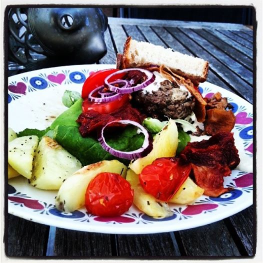 Även om sommaren inte är riktigt här har vi haft en liten föraning av den. Förutom värme genererar också sommaren tillfällen då man träffas. I helgen var jag hos mina föräldrar som i sin tur var barnvakt åt tre av mina brorsbarn och då behövs matidéer – det går ju inte köra samma krubb varje dag. Helst ska det gå snabbt och vara enkelt att göra också samt smaka gott. Min filosofi, märk väl – jag har inga egna knoddar, är att laga mat jag själv tycker om men som går att krydda upp lite extra. Oftast funkar den maten även bra till barn, må vara att jag ser ut som ett troll så de kanske inte vågar säga annat. Häromkvällen blev det älgburgare med olika tillbehör och då kan barnen själva välja vad de vill ha till.