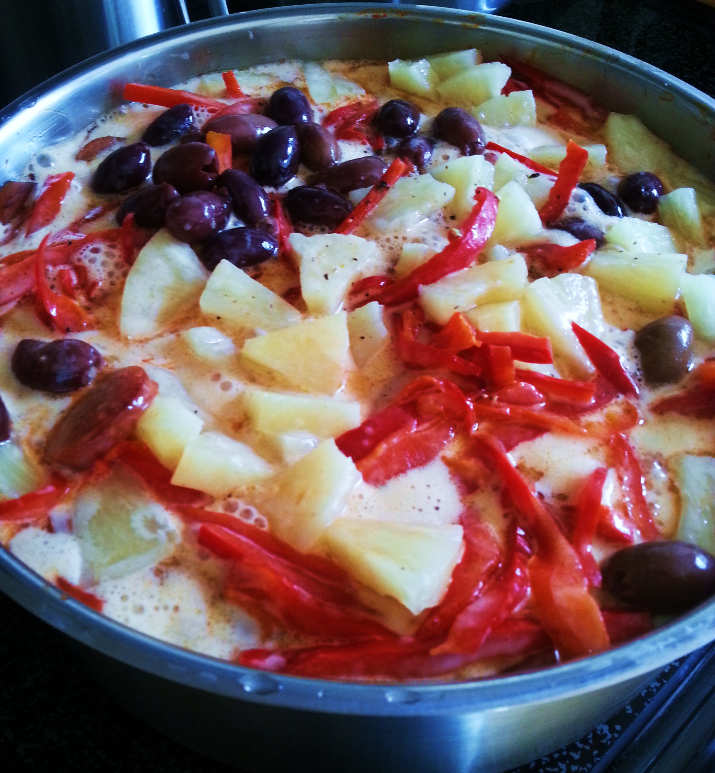 Jag har valt att uppdatera receptet en liten aning, bland annat tillsatte jag lite sambal oelek för hetta, lade till i ananas för sötma och champinjoner för att det fanns hemma samt kycklingfond för rondör. Man skulle kunna kalla det hela för köksarkeologi i en nutidskontext.