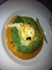 Vi kom igår. Jag och ett gäng andra. Landade på lite olika flygplatser och sedan strålade vi samman på en mycket märklig, men bra restaurang. Bibendum, i en gammal Michelin-verkstad i South Kensington. Vi beställde bubbel och gluttade i en av de rörigaste menyerna någonsin skådat. Jag bestämde mig för spenatmousse, pocherat ankägg och parmesancreme till förrätt. Sen tog jag lite ankleverterinne som varmis. Maten var sådär sjukt klassisk och fransk med tonvis av grädde och kraftiga smaker. Elegant var det inte, men gott!