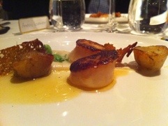 Första vinet. Första rätten. Pilgrimsmusslor, brynt smör, jordärtskockspurée och krasse. Jag älskar brynt smör och krasse! Pilgrimsmusslor går ju heller inte av för hackor, så första rätten slinker ner galant. Vinet är en riktig ‘bastard’. 50 Pinot Blanc och 50 Chardonnay. Ekat. Bra med fin balans och inte för mycket av det goda. På Querciabella dricker man gärna vinet efter minst 10 år. Jag tycker kanske att vinet är lite dyrt… 429:-. Nu ser jag framemot den äldre årgången som utlovats senare under kvällen!
