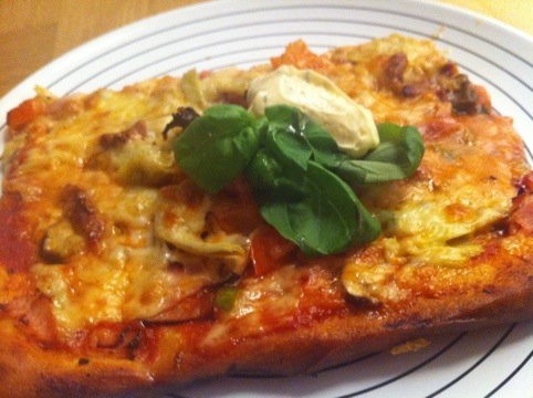 Hemmagjord pizza är då inte dumt. Fuskade genom att köpa färdig pizzadeg (ja, jag vet att det är lite dåligt, men så är det ibland). Toppingen bestod av tomat (som sås, färska och soltorkade), kronärtskocka, skinka, purjolök, brie, mozarella och prästost! Ja, jag gillar ost. I glaset hade vi Engelbrecht Els Proprietor’s Blend 08. Inte så tokigt må jag säga!