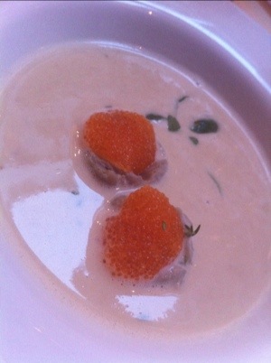 Kronärtskockssoppa med löjrom. Krämigt och smakrikt. Anders är verkligen en mästare på soppa. Till detta drack vi Vouvray från -94. Aningen trött, men ändå en toppenkombo! Nu väntar vi på en hemgjord ankleverterrin. Oj, oj, oj!