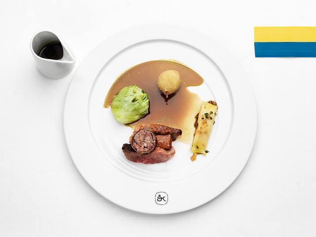 - Helstekt anka kryddad med grönpeppar, fylld ankhals med mejram, blodapelsinsås, mille-feuille på spetskål och pistagenötter, potatiscanneloni smaksatt m miso samt fylld och krispig lättrökt lök (Fotograf: Magnus Skoglöf)
