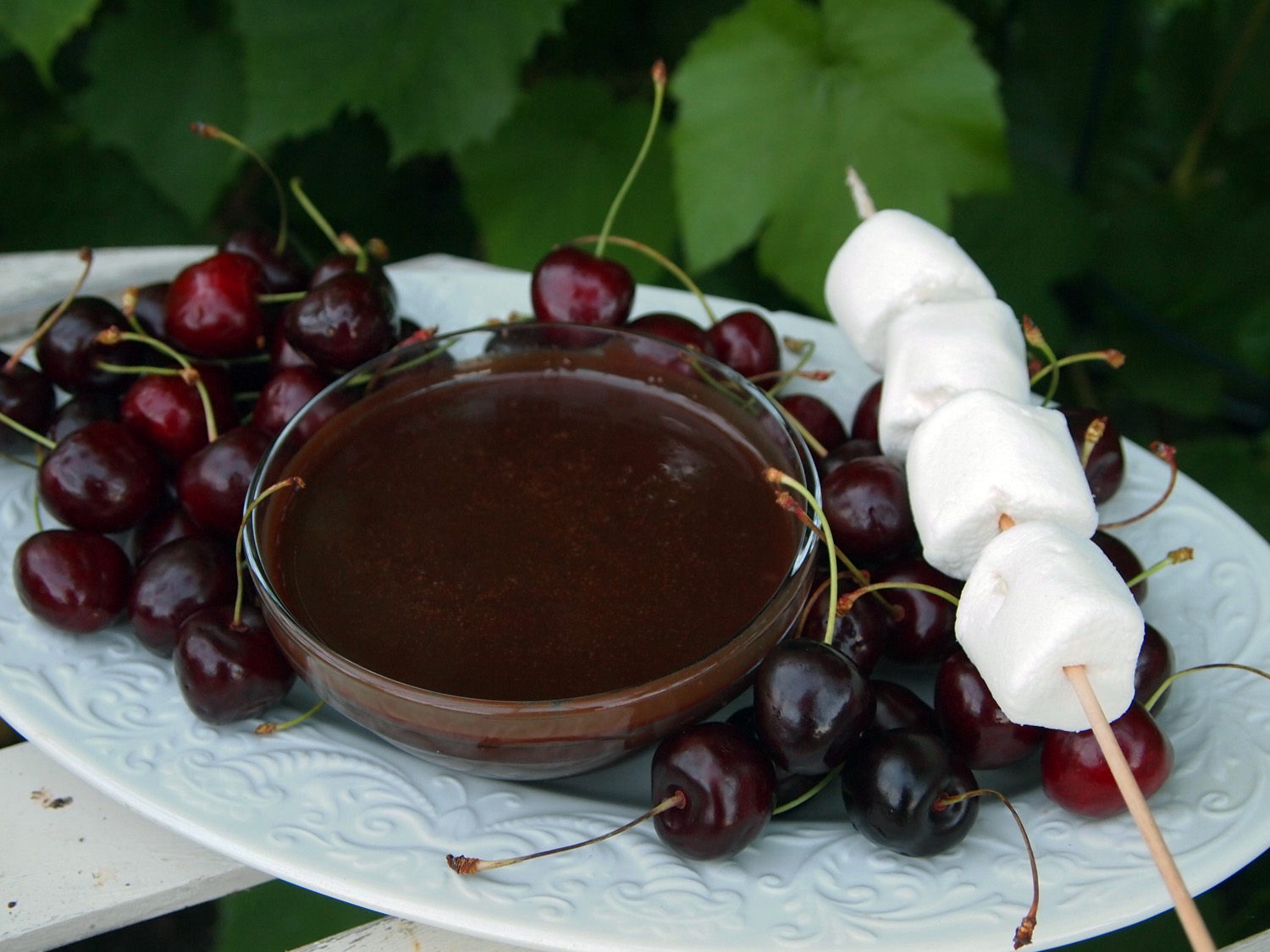 Grillade marshmallows med varm chokladsås och färska körsbär