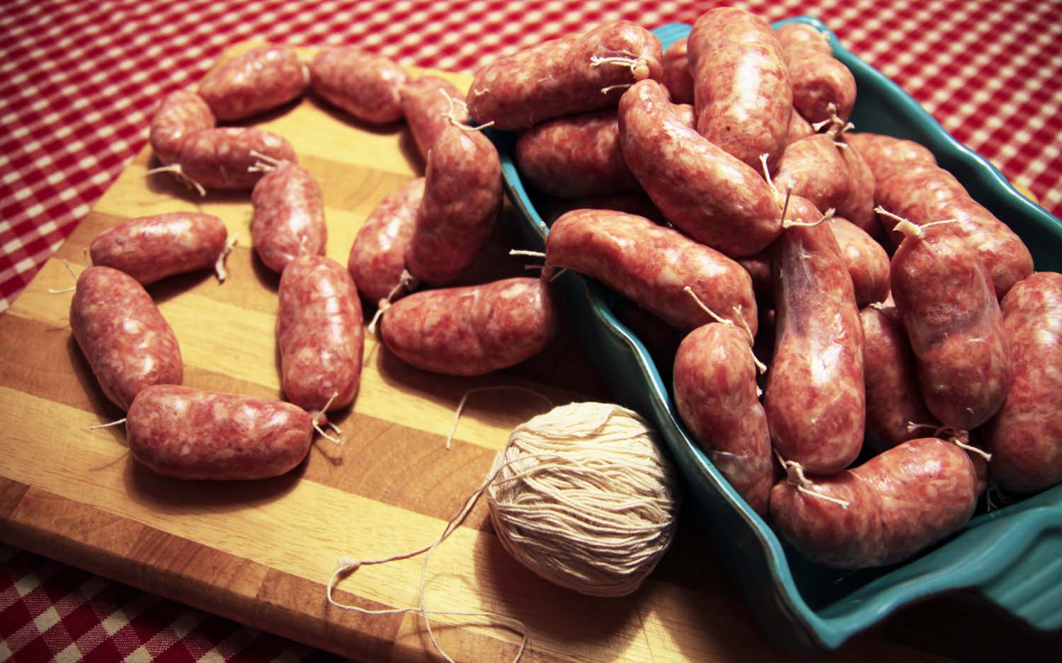 Att göra korv är kul och faktiskt enkelt. Att ha en maskin med korvhorn underlättar såklart jobbet. Jag har en maskin med ganska grovt horn så jag använde svinfjälster och fick därför knubbiga prinskorvar men herregud vilken smak. Och, utseendet spelar ju ingen roll. Serverade de små korvarna i korvbröd med rödkål smaksatt med torkade fikon. Tillsammans med en stark grov senap blev det en riktig lyckad jultapas.