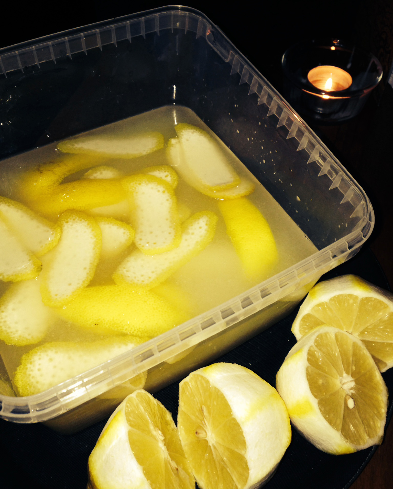 Filtrera citronjuicen genom ett kaffefilter så den blir så klar som möjligt. Blanda samman med sockret, inklusive skalet från de 2 citronerna. Kallsmält till en sockersirap. Justera med vatten för att nå önskad syra/sötma. Skalets oljor ger en rik citrussmak åt det bittrare hållet och förlänger även hållbarheten.