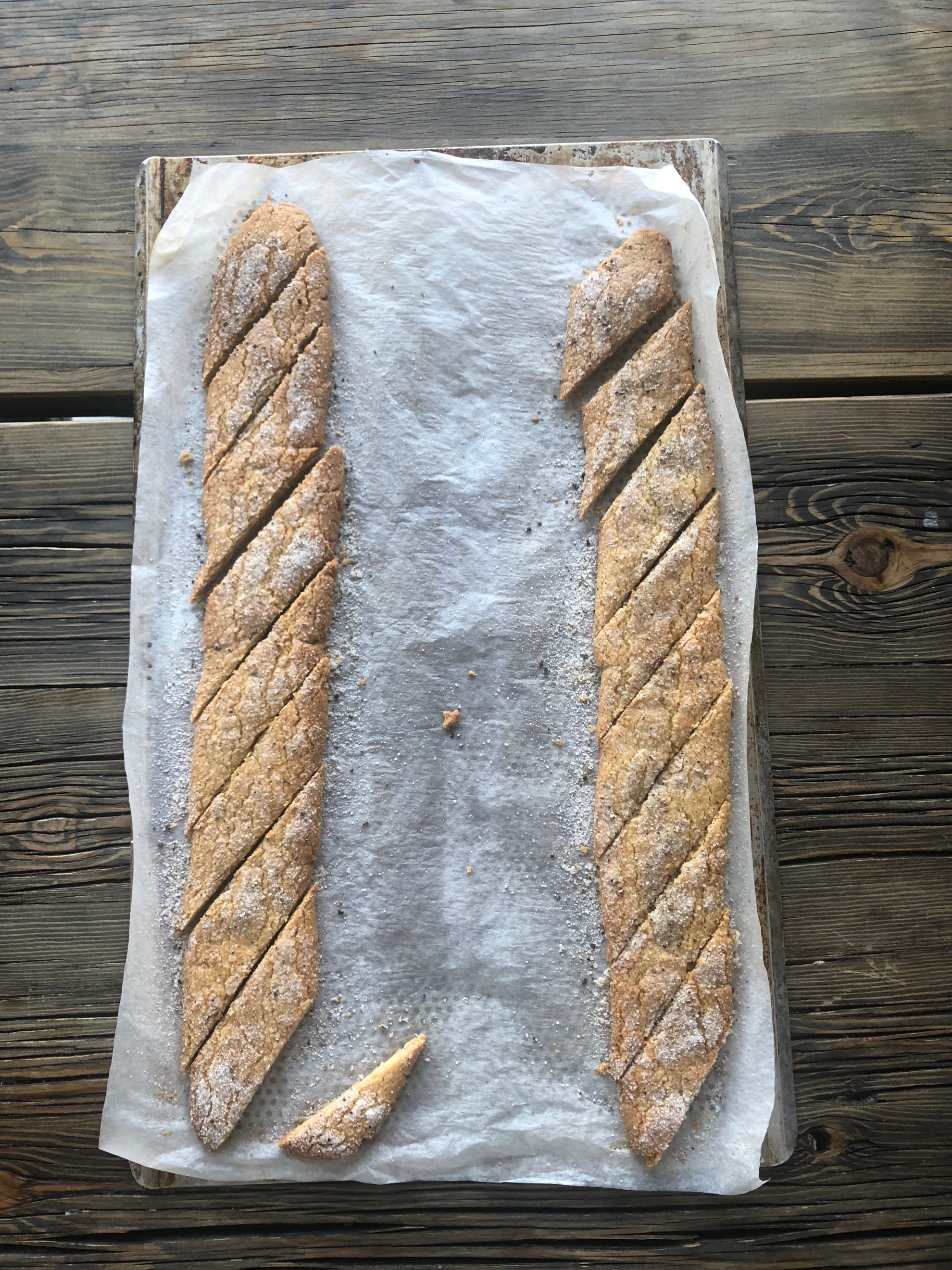 Arbeta ihop allt till en smidig och fin deg. Dela upp i 6 bitar och rulla plåtlånga. Platta till med handen, spraya vatten på och strö över kardemummasocker. Baka på 180 grader i ca 8 min, skär när de är varma. Låt svalna.