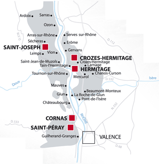 Crozes-Hermitage är det viktigaste distriktet där, sett till kvantitet. Typiskt för syrah-vinerna därifrån är smaker och dofter av svartpeppar, skogsbär och frisk syra.