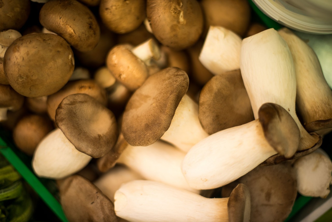 Eller vegetariska bönbiffar med stekt svamp och rostad grönkål med rostade fröer.