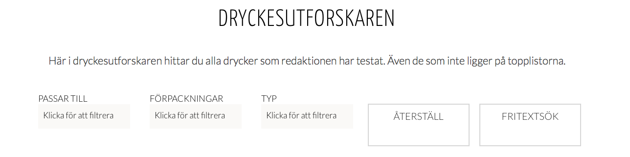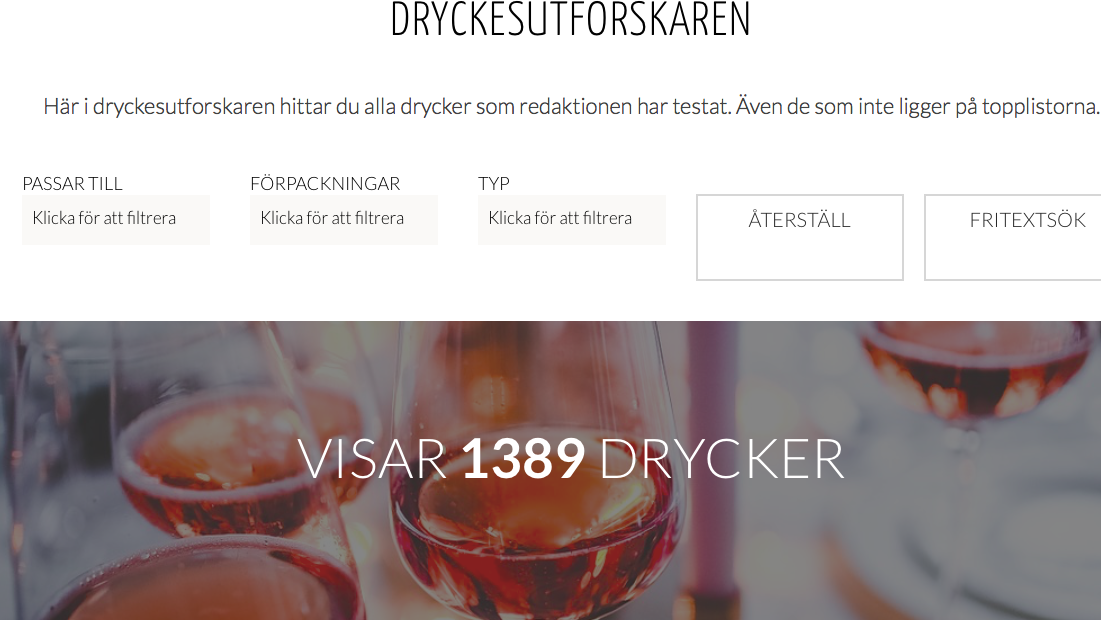 Här ligger för tillfället nästan 1400 drycker inne. Kanske har du fått ett vintips från en kompis eller sett en annons någonstans om ett visst vin. In och finn! Finns det inte i våra listor, så maila oss gärna. Vi hjälper dig med andra tips och tar gärna emot feedback. Vi har även gott om recept, tips på restauranger och givetvis artiklar om producenter, druvor och vinländer.