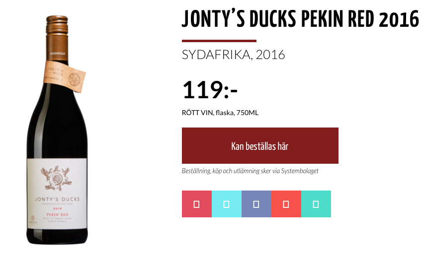 Kuriosa: Avondale är en vingård i Sydafrika som arbetar både ekologiskt och biodynamiskt. För att undvika starka bekämpningsmedel i sina vingårdar, har man tagit hjälp av hungriga ankor. De äter villigt upp sniglar och andra kryp som kan förstöra vingården. Namnet Jonty´s Ducks är alltså en hyllning till de hungriga och arbetssamma ankorna.