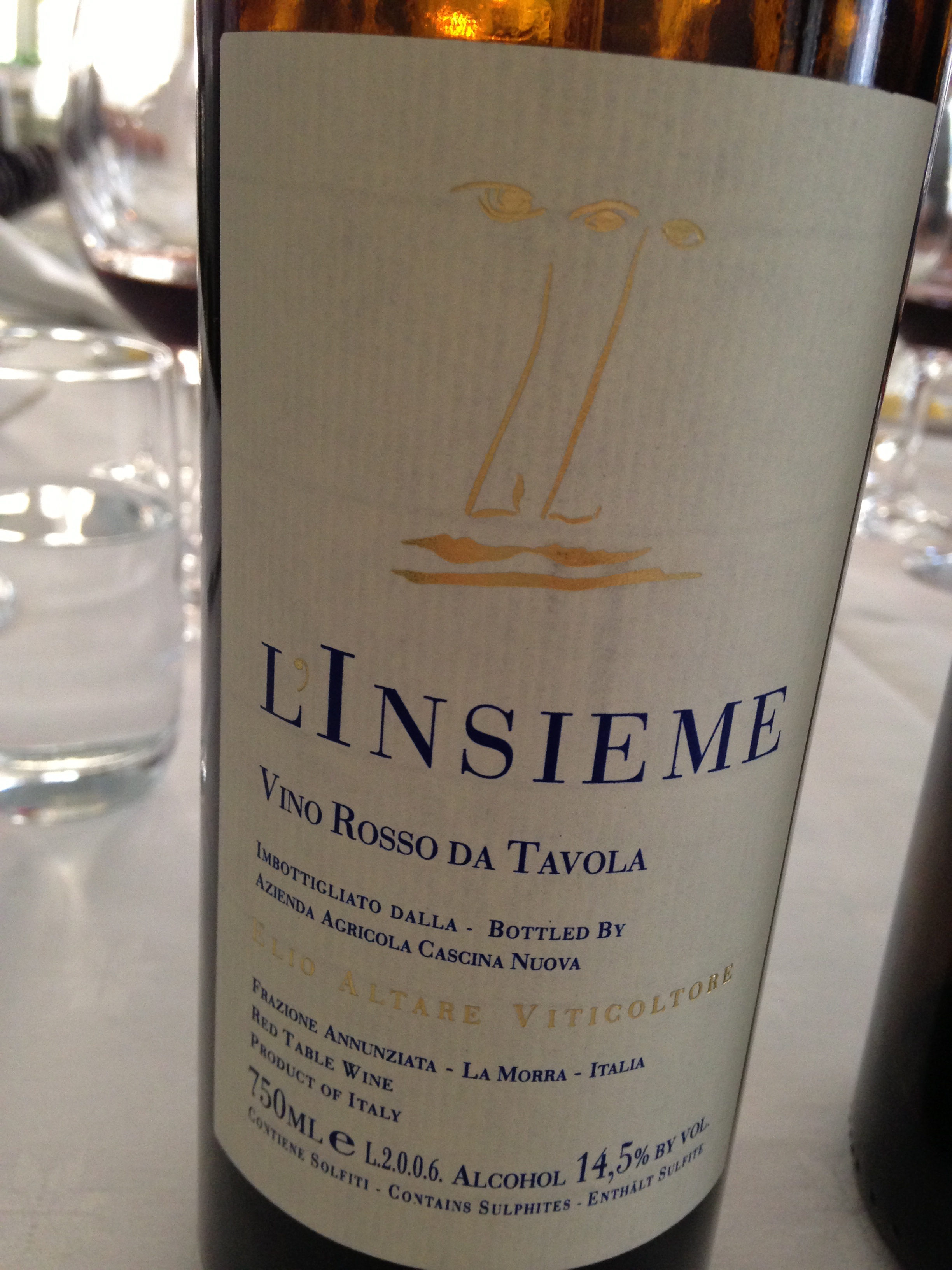 L’Insieme betyder tillsammans på italienska. I detta fall handlar det om ett vin som görs tillsammans med sju olika vinmakare i Piemonte. Flasketiketten är densamma hos alla, fast de gör sin egen blend. Projektet startades 1992 och pengarna går till välgörenhet. Det blir allt mellan 60.000-90.000 euro per år till olika föreningar i världen. 2006 är en blend på 40 % cab. s, 20 % barbera, 20 % nebbiolo, 10 % dolcetto och resterande syrah och petit verdot. En superbarolo om man får kalla det så, som dessutom är supergott. Stilen är silkig och mer av ett modernt snitt, med fantastiska tanniner, fin syra och tät frukt av körsbär, lingon och rosor.